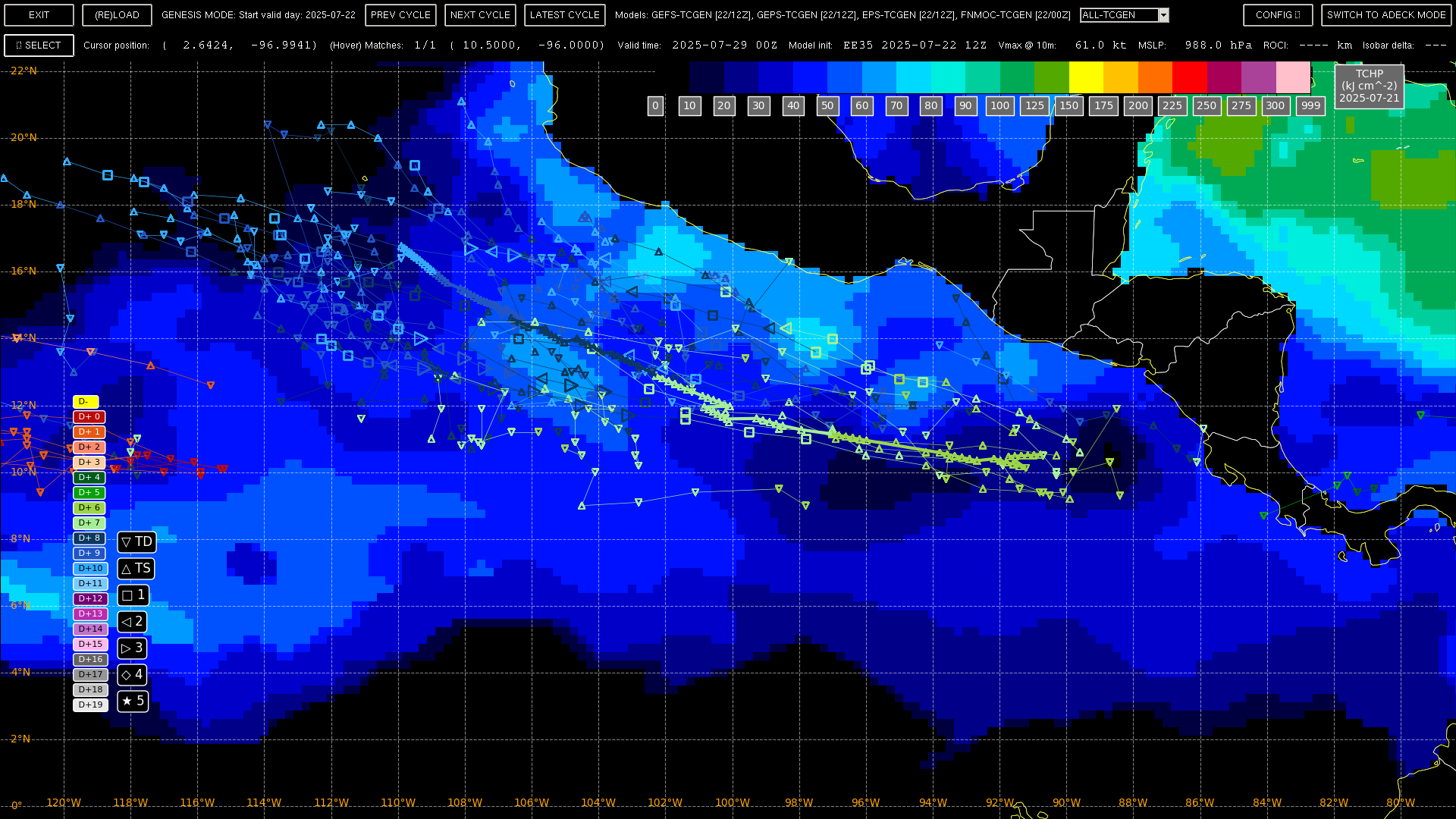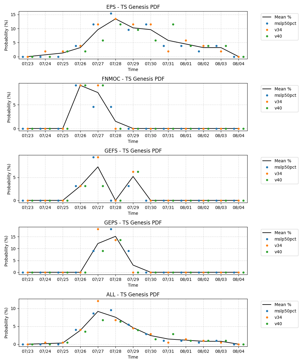 This is what the probs look like for me from the ensembles in EPAC as a whole (including the storms that reach 34 kt BEFORE crossing over into the CPAC), EPS obviously the most bullish as a whole reaching now ~65% chance of a named storm by the end of its 10-day window (other ensembles are only covering 5 days) (TZ is Pacific):
