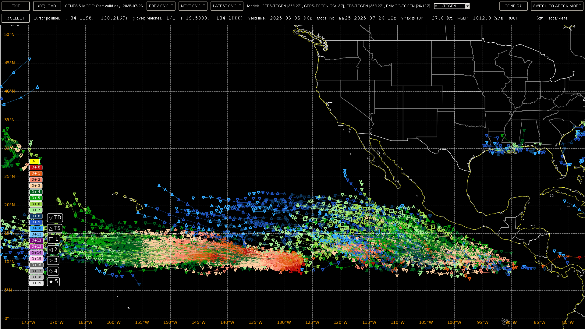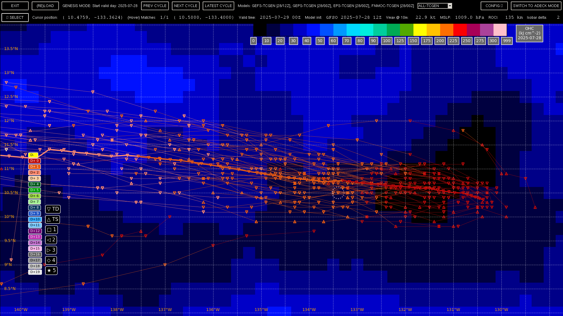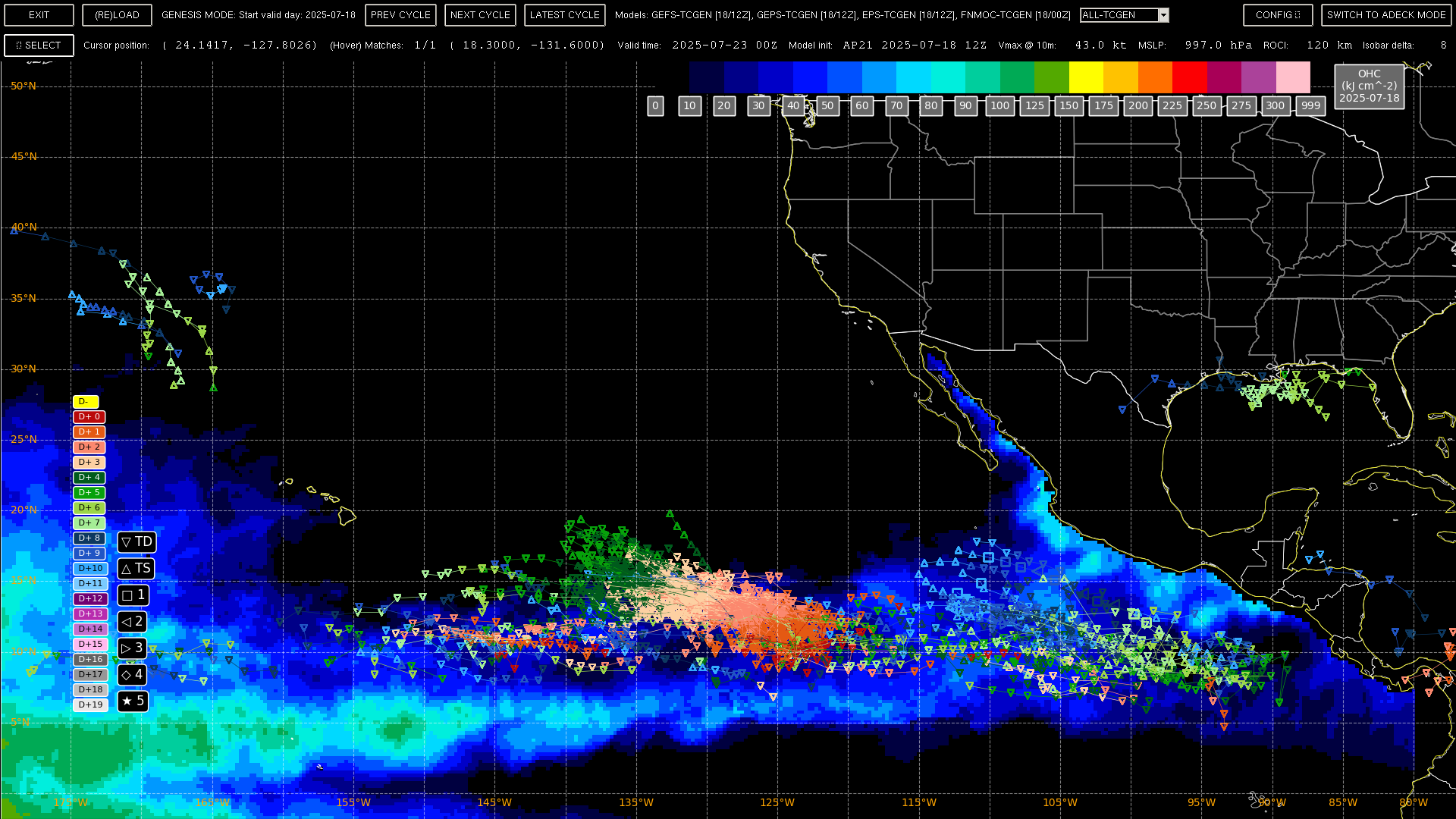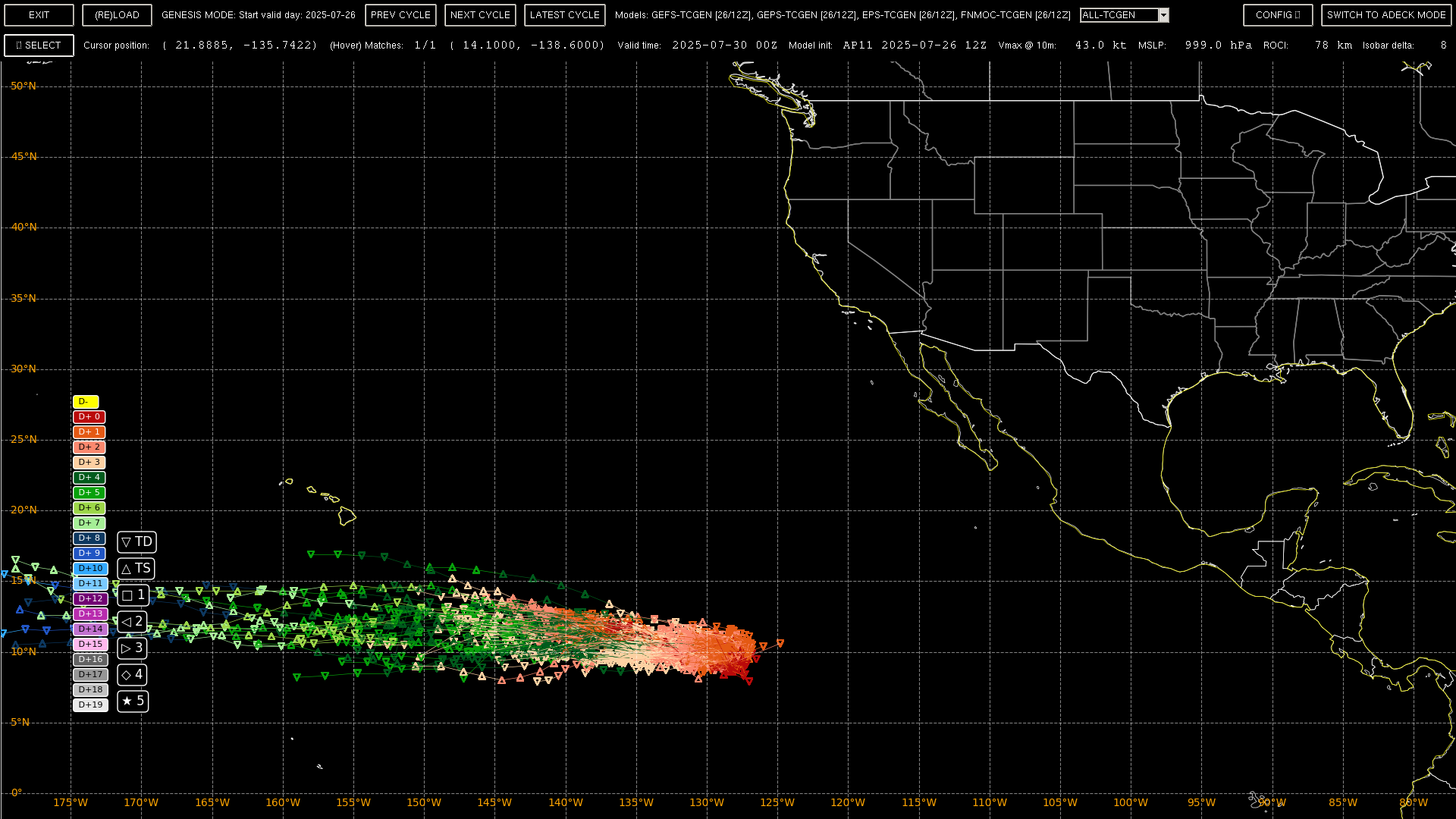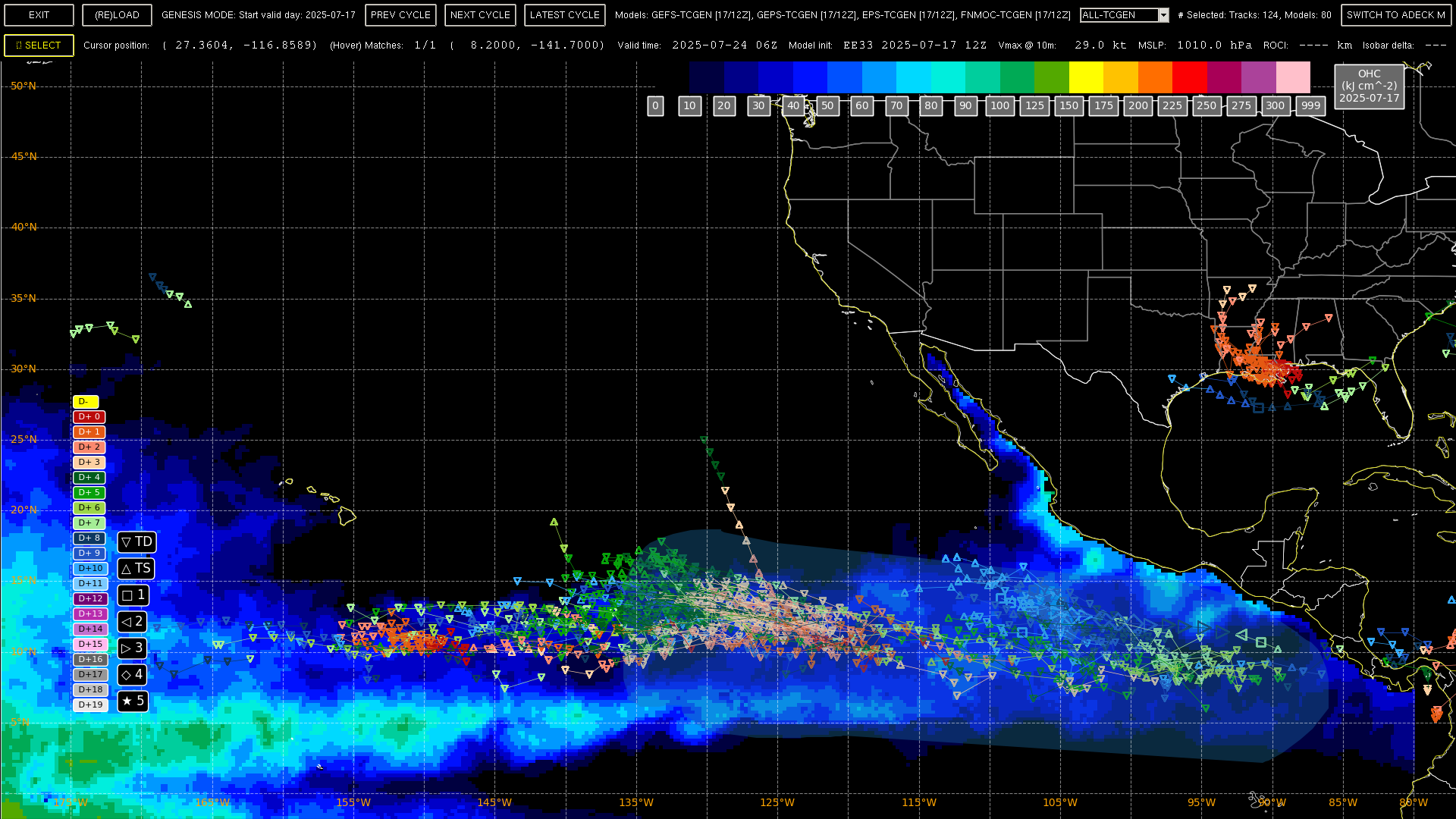 For the other system near 130W, there seems to be two genesis locations in the area (137W and 127W); I've isolated it based on storms forming west of 124 W in the next 5 days, and eliminated those tracks with points west of 140 in the next day to eliminate the CP storm).