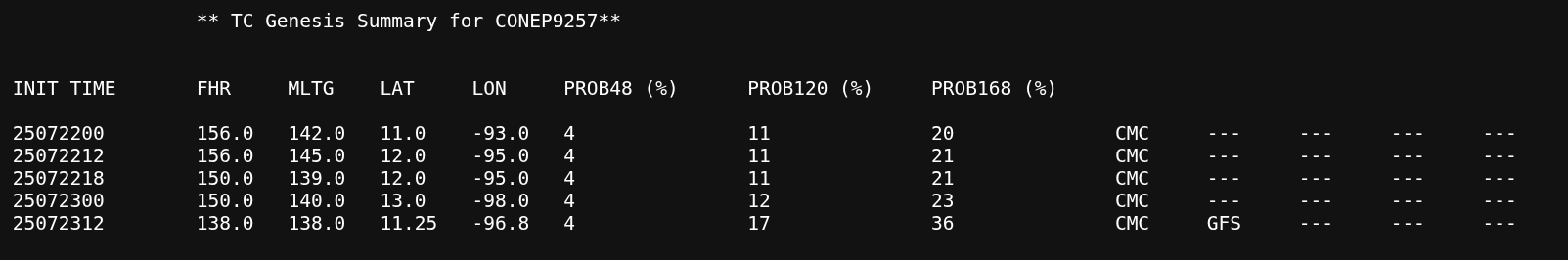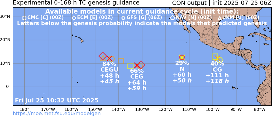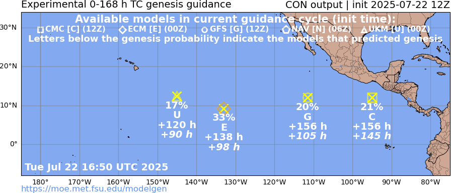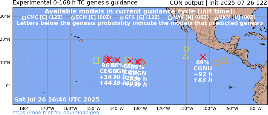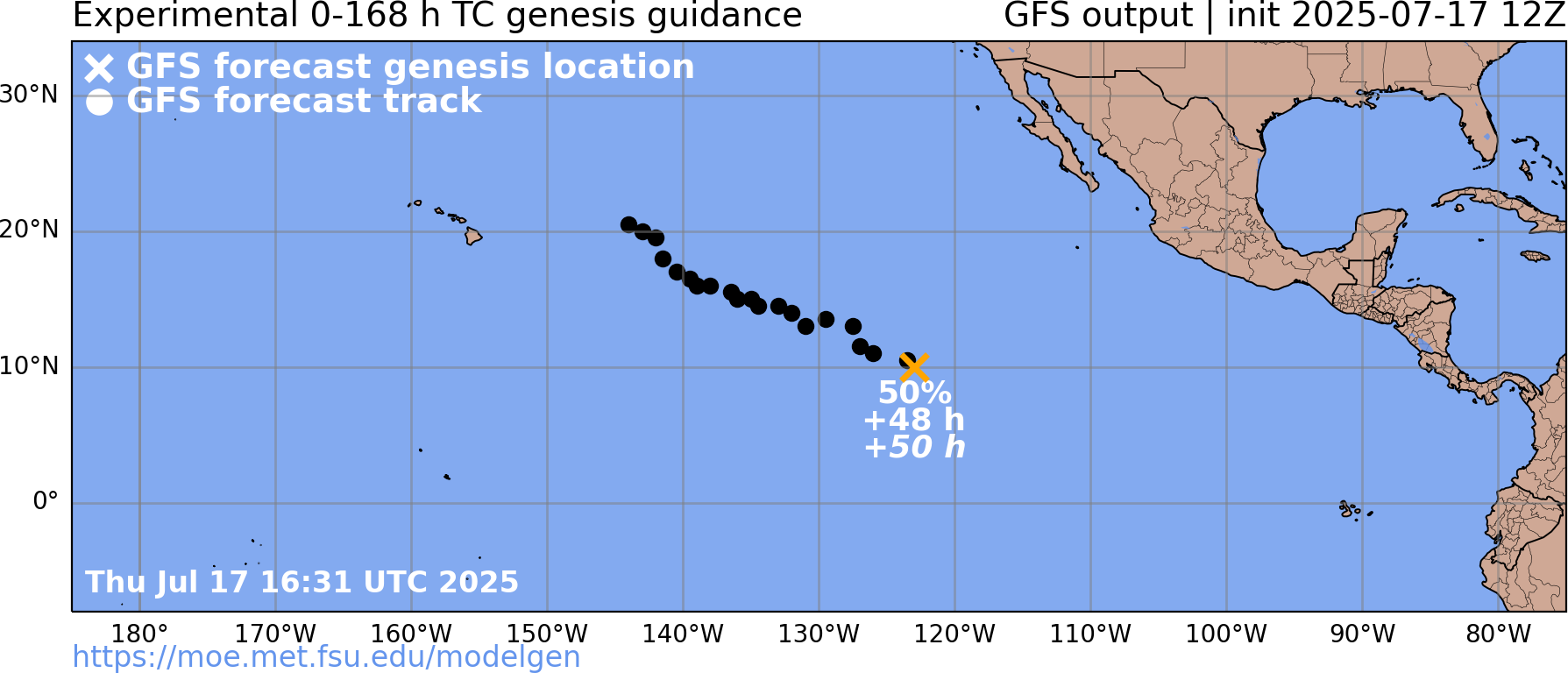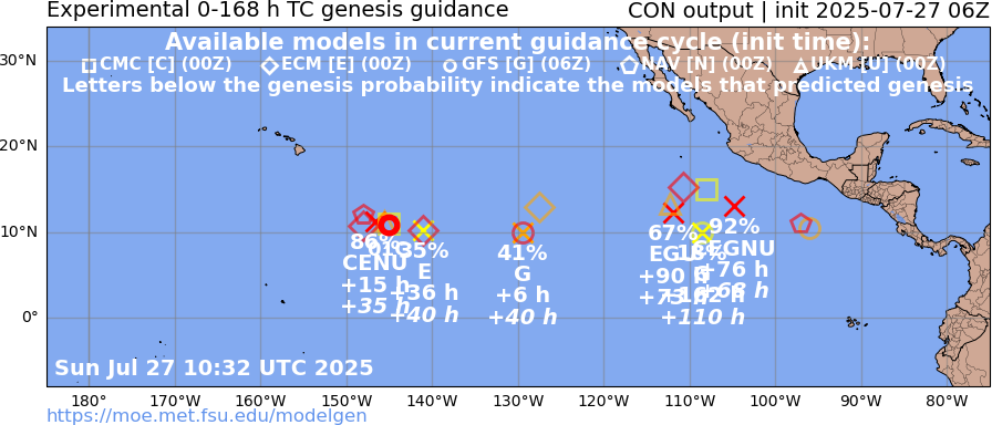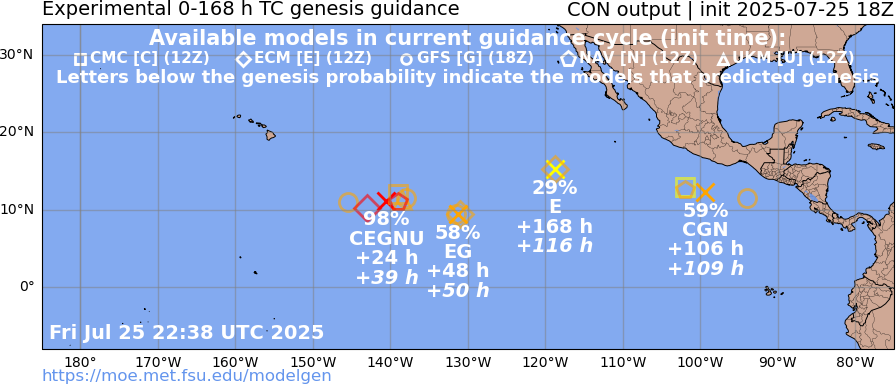 About 3 different genesis events predicted by various det. models in the next 7 days east of 140W (cumulatively this should mean something should develop; but EPS/12Z probabilities indicate its less than even odds for 7 days.