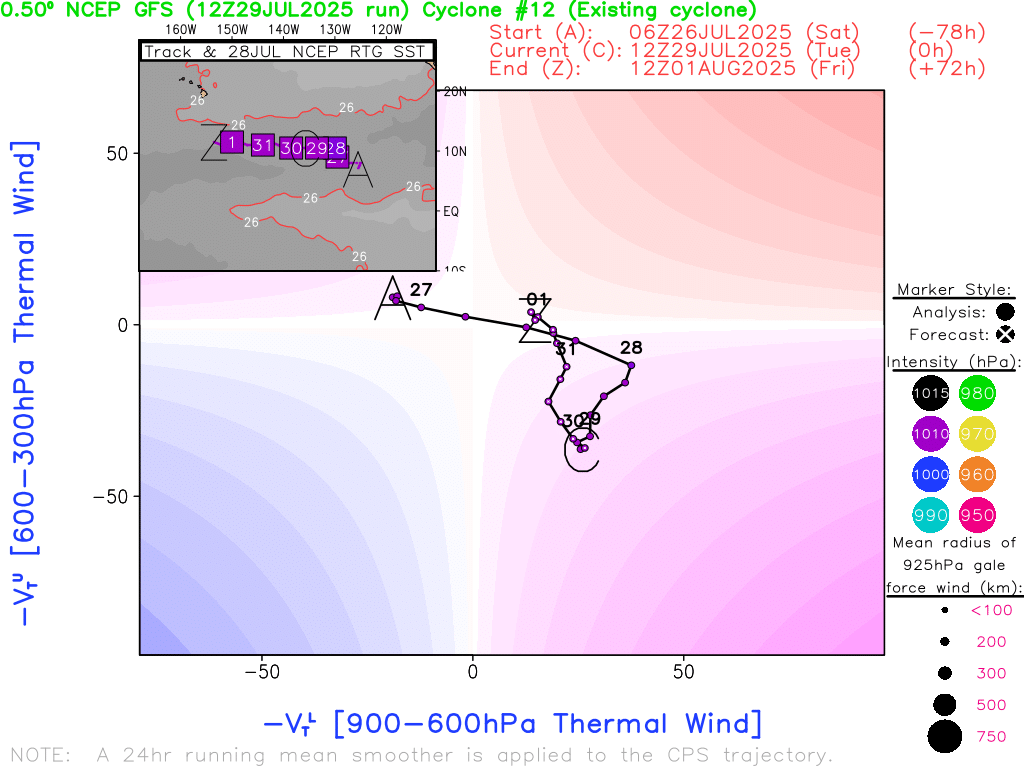 The probabilities of the circulation near 130W forming into a named storm before crossing over into the CP seem to have dropped a bit as less than 10% now of members per EPS/00Z forecast a TS in the short timeframe of the next 3 days, and that is based on an over-estimate of its current wind speed by some of its members. An Oceansat-3 pass from earlier shows a LLCC with some rainflagged wind speeds that are near TS strength on outerband but it isn't a TS yet as the mid level circulation isn't there (solid low level circulation with 800mb rvor > 100e-6 per CIMSS); phase analysis (FSU) from GEFS/06Z and IR sat. imagery also shows it not there yet.