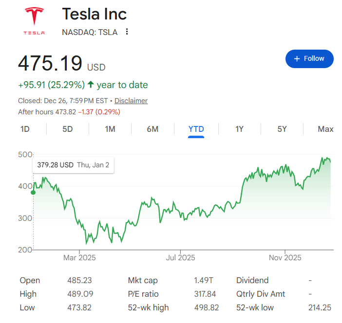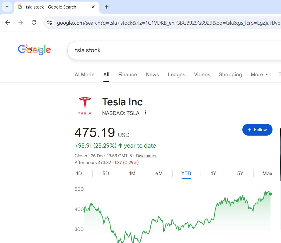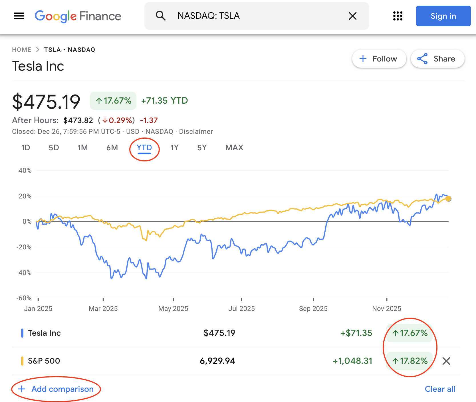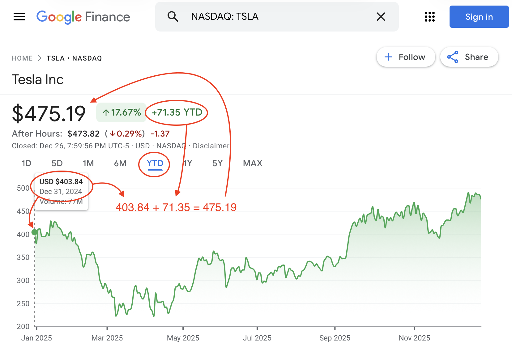 @ChristopherRandles yeah, i see the search results page (source is Google's Knowledge Graph) gives it wrong. When you click on "More about Tesla Inc" takes you to Google Finance where the YTD starting point is correct.