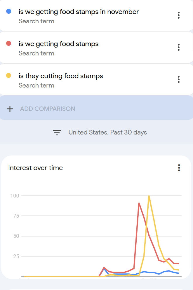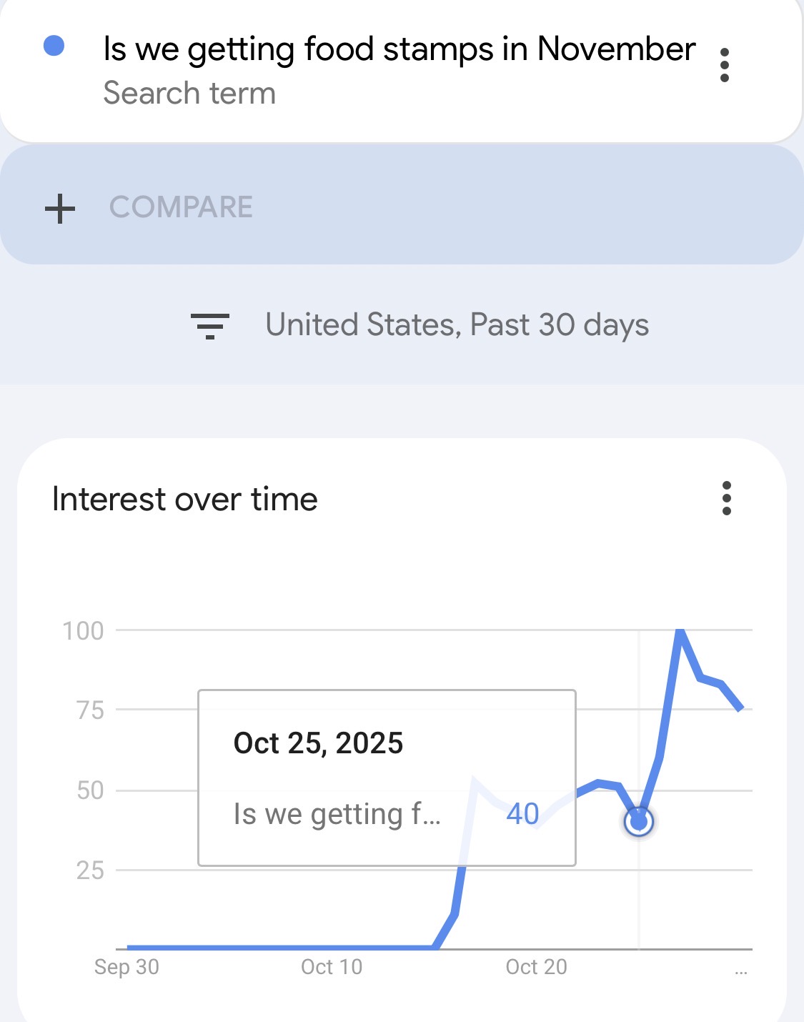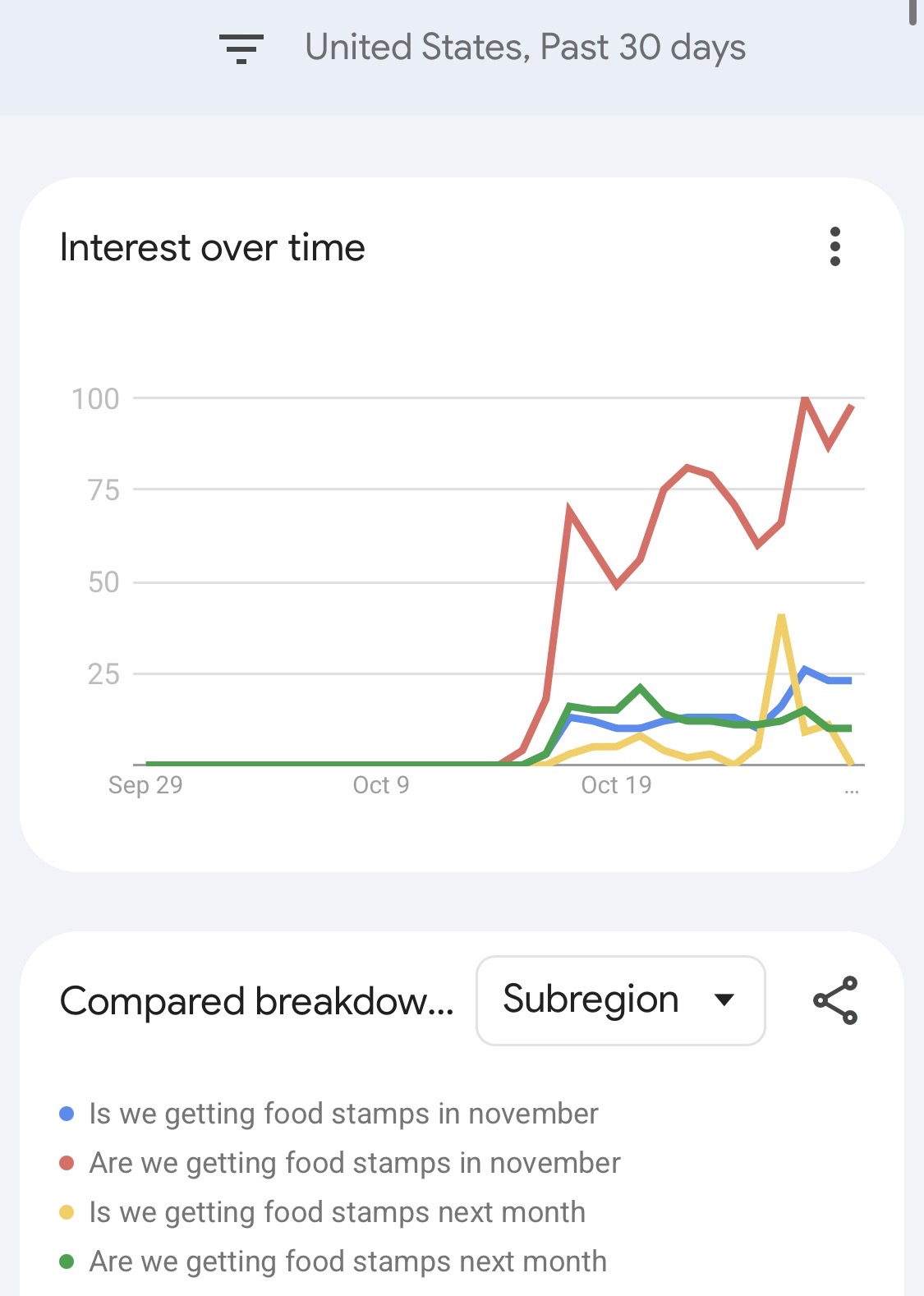 @spiderduckpig the spike on the 25th is probably because that was immediately after USDA announced it will not be using emergency funds to cover SNAP, which is when there was a spike in searches.