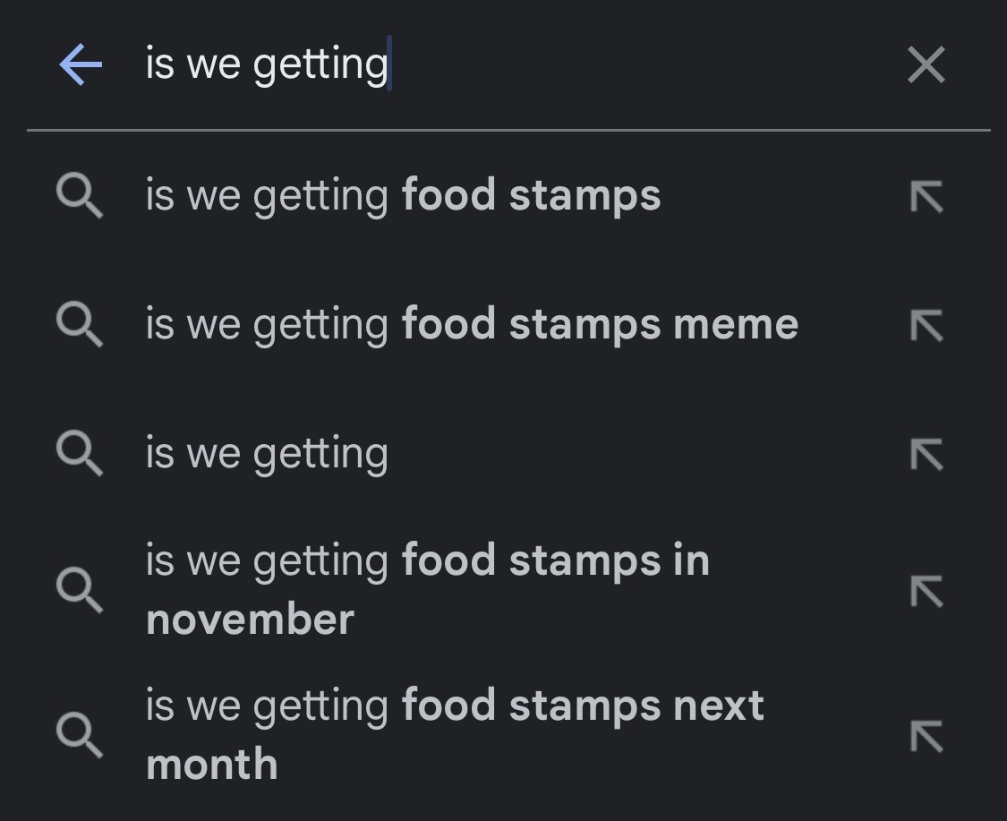 @SkyVelleity It seems very likely to me that the vast majority of those "is we getting food stamps" searches aren't from a legitimate phenomenon of low-income people using AAVE or non-conjugation but rather a self-reinforcing virality loop where people who see the supposed search recommendations get curious and try to search it up themselves.