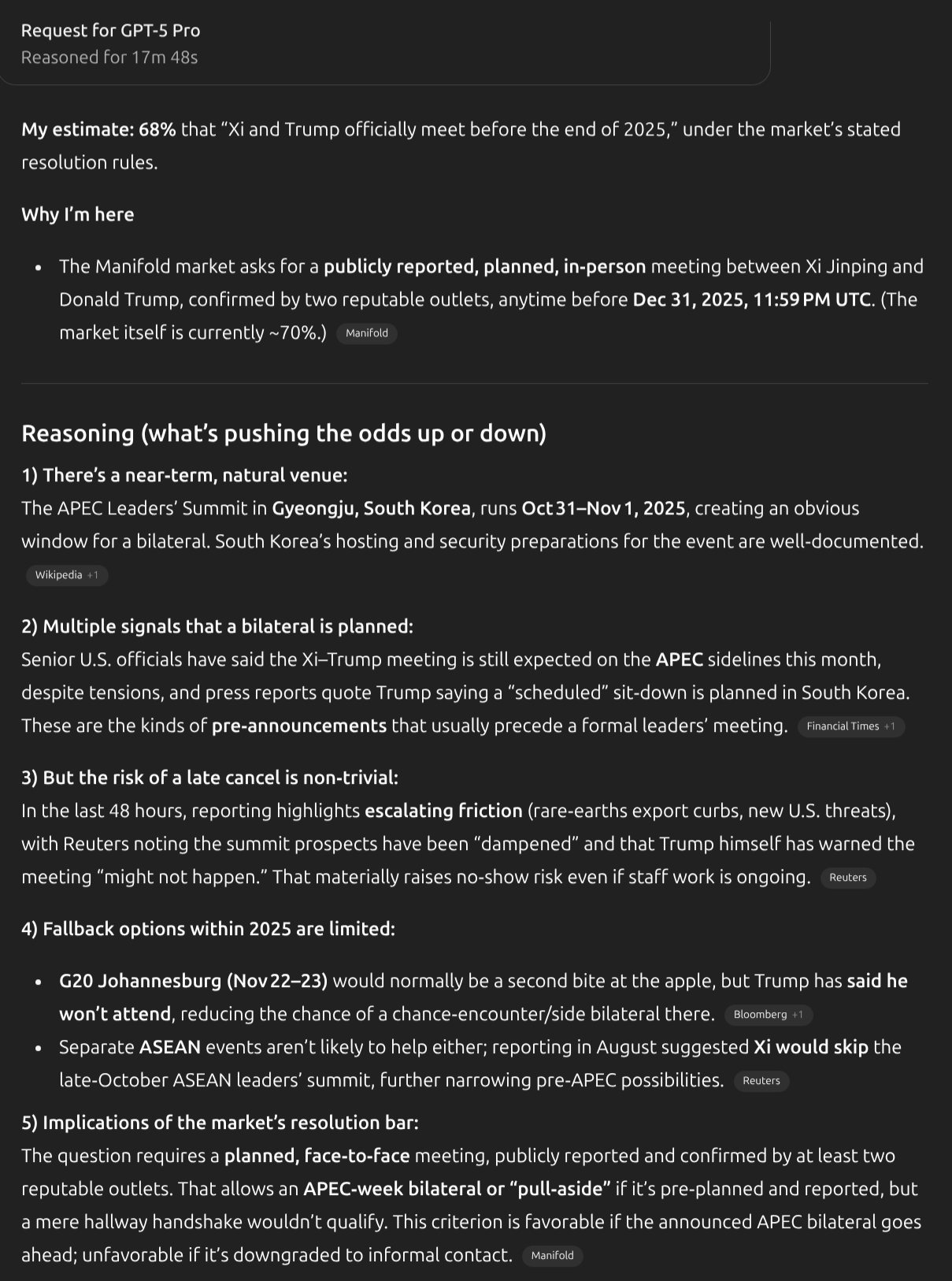 This market will resolve to "Yes" if Xi Jinping and Donald Trump officially meet in person at any point before December 31, 2025, 11:59 PM UTC. An "official meeting" is defined as a publicly reported, planned, face-to-face encounter between the two individuals in their capacities as heads of state, or in a recognized diplomatic or political context. This includes meetings at international summits, state visits, or bilateral discussions. The meeting must be confirmed by at least two independent, reputable news organizations (e.g., Reuters, Associated Press, BBC, New York Times, Xinhua, Wall Street Journal). If no such meeting occurs or is credibly reported by the specified deadline, the market will resolve to "No".