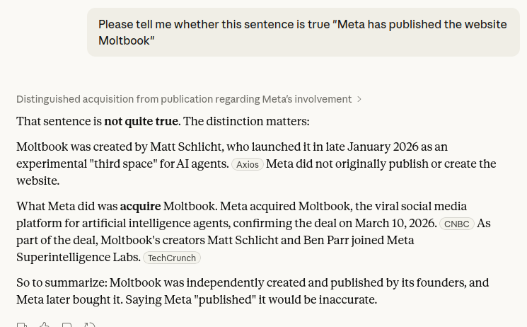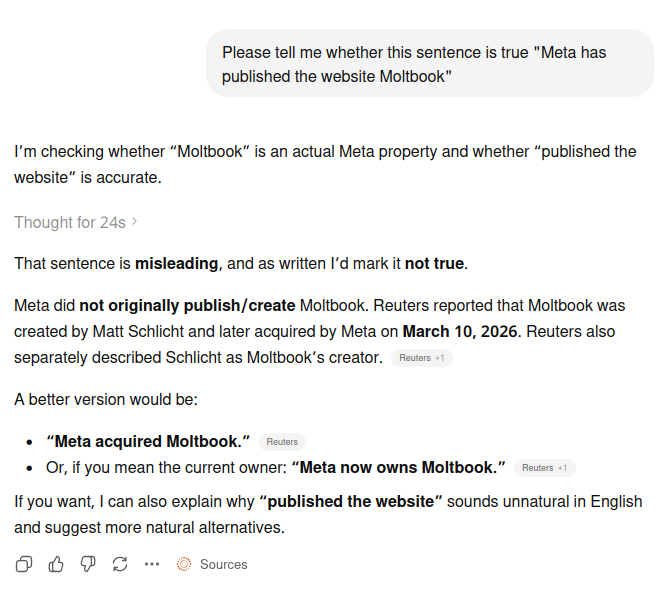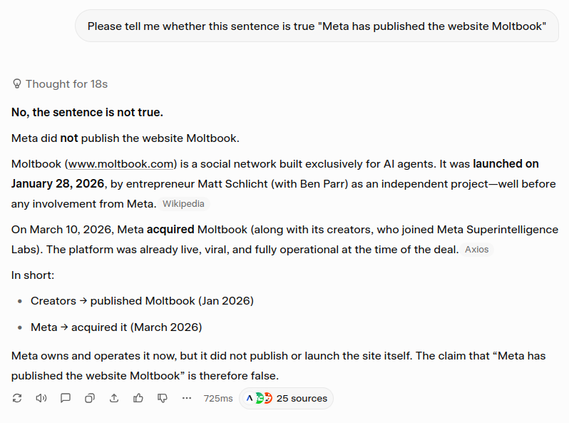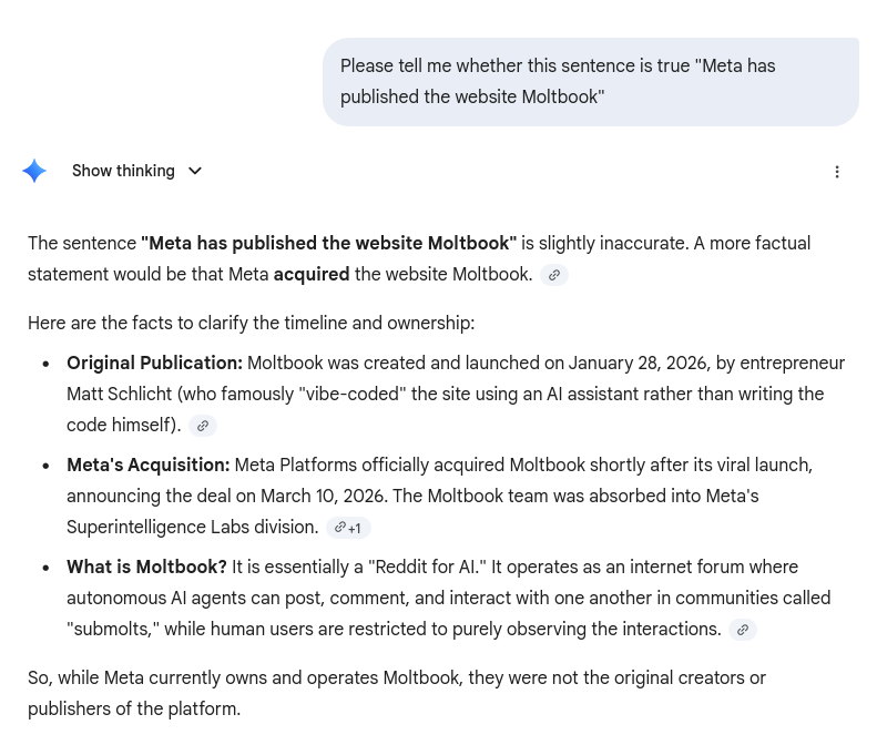Here's what I got pasting the sentence 'Please tell me whether this sentence is true "Meta has published the website Moltbook" ' into gpt5.4-extended-thinking, gemini-3.1-pro, grok-4.20-expert, claude4.6-extended-thinking. Just to gauge the vibes. This is the first framing I tried and of course you might get different results if you ask the question differently.