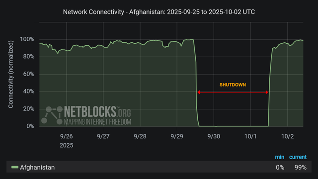 As of September 30, 2025, Afghanistan is experiencing a complete nationwide internet blackout (https://www.bbc.com/news/articles/cdxqdy5nrlqo) imposed by the Taliban administration. The shutdown began with provincial restrictions in mid-September 2025, initially targeting northern provinces, before expanding nationwide. Taliban officials cite preventing "vice" and "immoral activities" as justification for the ban, and state that the ban will remain in effect "until further notice".