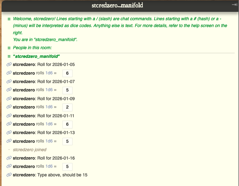 Update 2026-01-15 (PST) (AI summary of creator comment): Verification of rolls: The dice rolls on rolz.org can be verified by visiting the room at https://rolz.org/dr?room=stcredzero_manifold. Users can join the chat for free, either by creating an account or by simply entering a username without login.