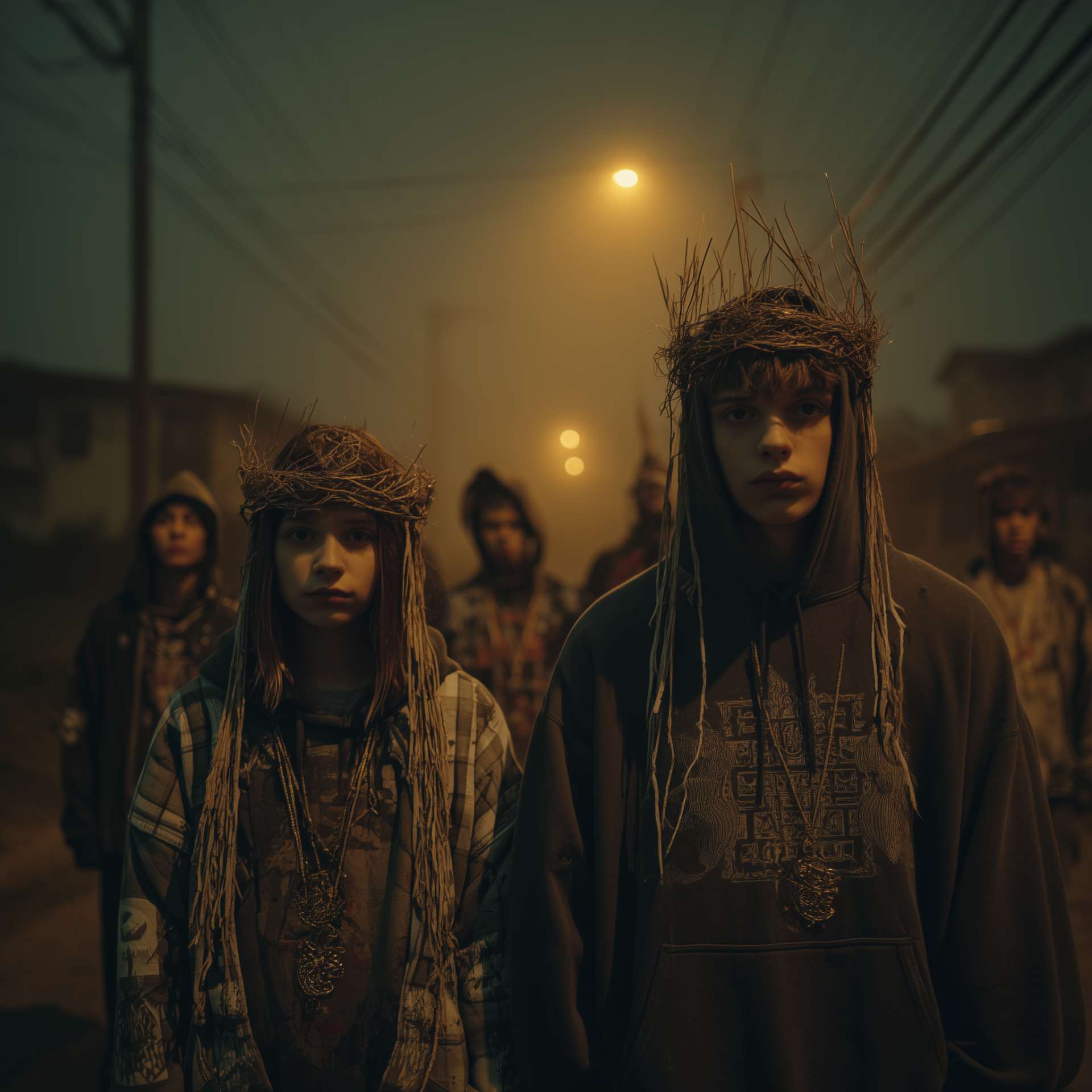 "Modern Halloween orchestral-trap anthem with haunted club energy, 122 BPM (halftime drops), Rotating centers: Verses = F Phrygian (1-♭2-♭3-4-5-♭6-♭7) with ♭II brass stabs and pedal drones; Pre-drop = octatonic (H-W) runs and tritone pedal (B/E♭); Chorus = B♭ minor with ♭VI→♭II hits over B♭ pedal; Bridge = D double-harmonic minor bursts for “spell” color, Orchestration: colossal brass, razor string ostinatos, toy-piano glints, low male chant + children’s whisper choir, Sound design: sidechained engine-bloom sub, bone-chime foley hats, door-knock samples (four-hits motif), wind howls, distant bell, Groove: glitch accents (5/4 over 4/4), trap hats, war-drums, Arrangement: swagger stops, call-and-response brass with vocal, drop-to-silence turnarounds, Mix/master: cavernous hall IRs, mono-solid sub, transient-safe lows, long tails, loud but clean; 2030s, dark yet danceable"