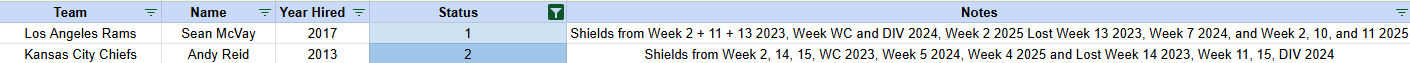 Andy Reid gains (and keeps this time) a 3rd shield, the first coach to end a week triple shielded. Shane Steichan also gained a shield, while Doug Pederson is now vulnerable after losing his shield.