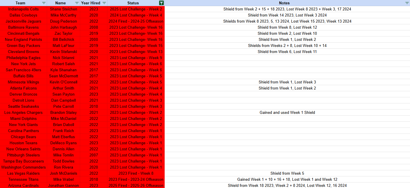 I've thoroughly looked for challenges in all the game's play by play, but let me know if there are any errors (or an easier database for challenges than going through each games play by play) for current alive coaches. I will update the above picture weekly (by the Thursday night game).