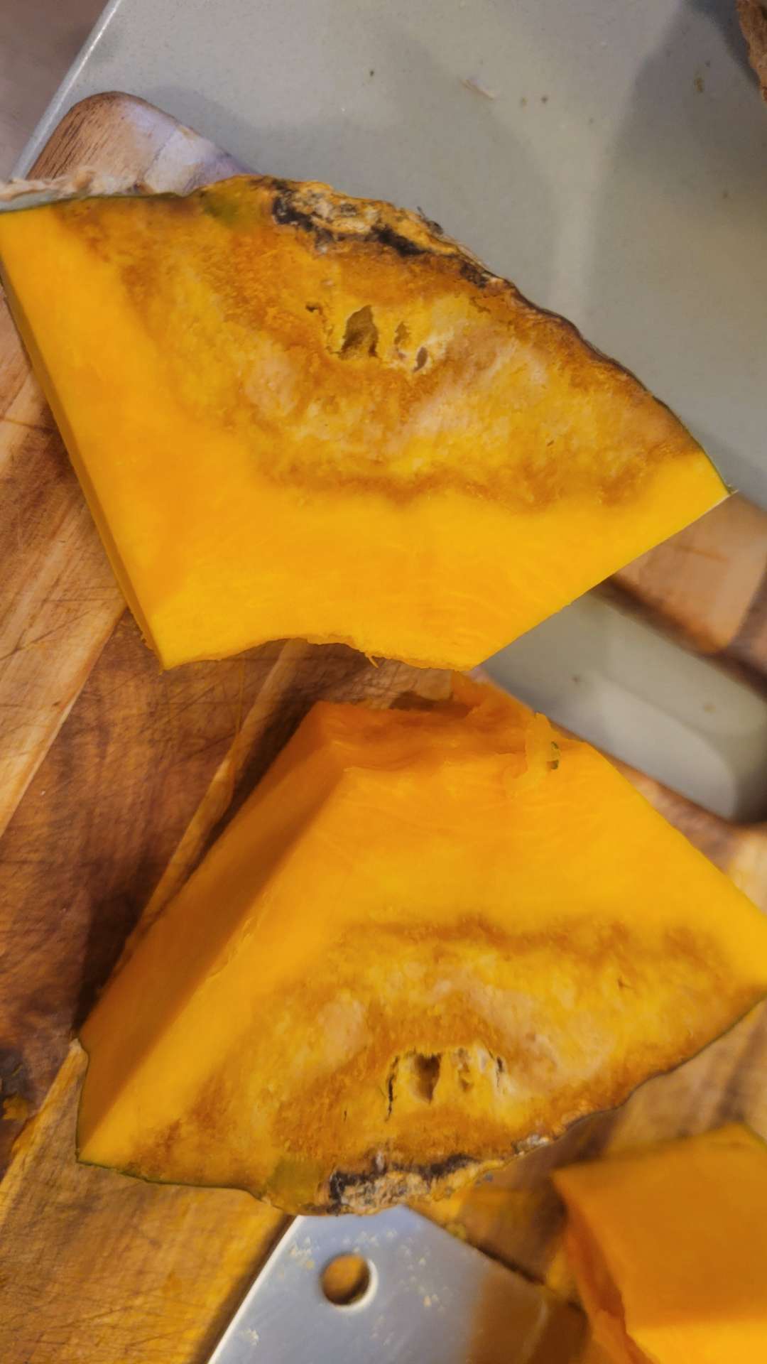 @Stralor There was rot on one edge. I've cut that bit out, with no harm to the majority, and sliced the first half into big slices to roast. Roasting them is an essential first step no matter what I make with them.