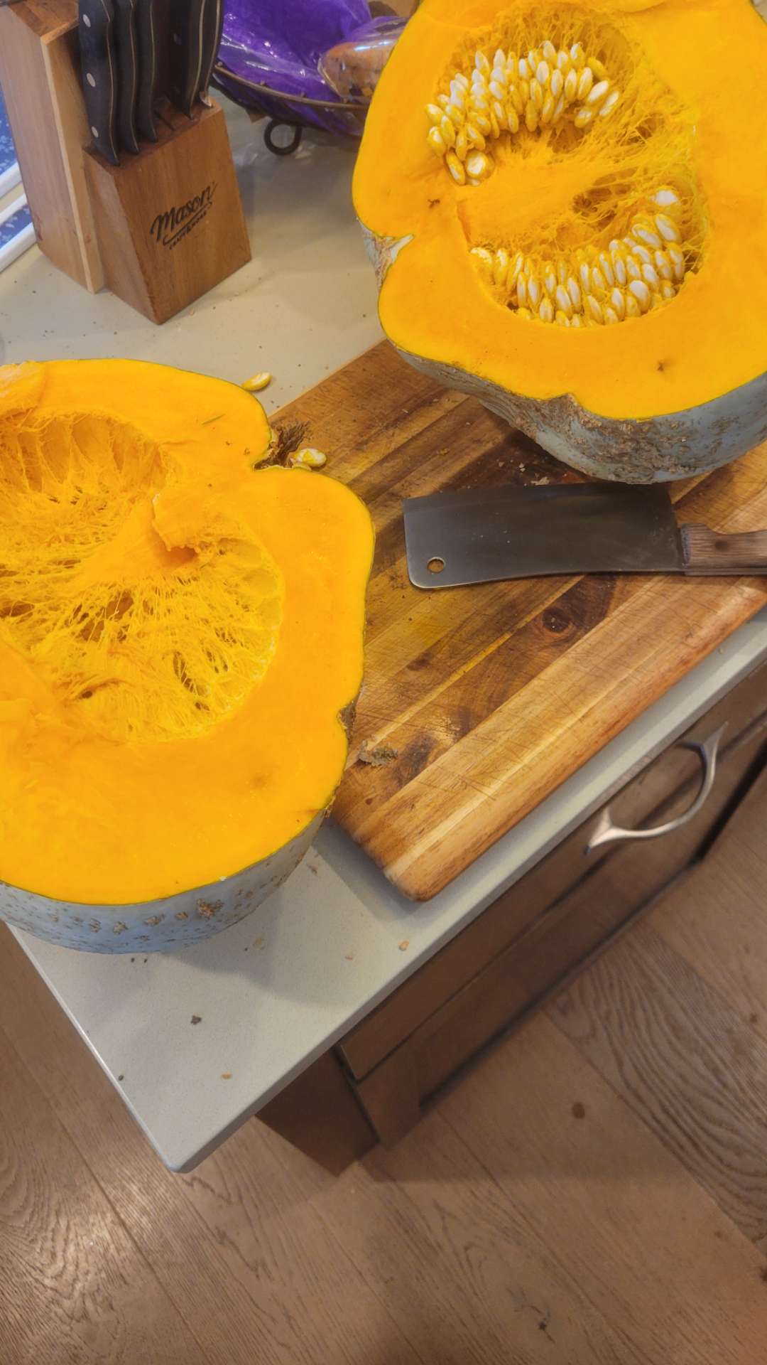 The picture above is the big sweet meat, and it's big enough to make 2 full pots of soup, ~4 pies, a dozen or so large roasted slices as mains, or a mix of those and lighter dishes. I also have a second one that is modestly smaller that is hanging out front, tantalizing any local teens to cause trouble (not usually a problem). Please excuse the awful lighting and poor angles.