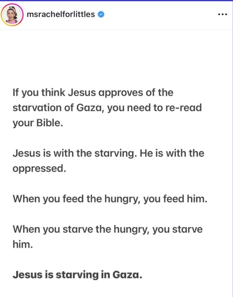 The post you shared from Ms. Rachel is a straightforward repetition of Christ's exhortation in the Sermon on the Mount, that by giving food to the hungry, "Amen, I say to you, whatever you did for one of these least brothers of mine, you did for me"