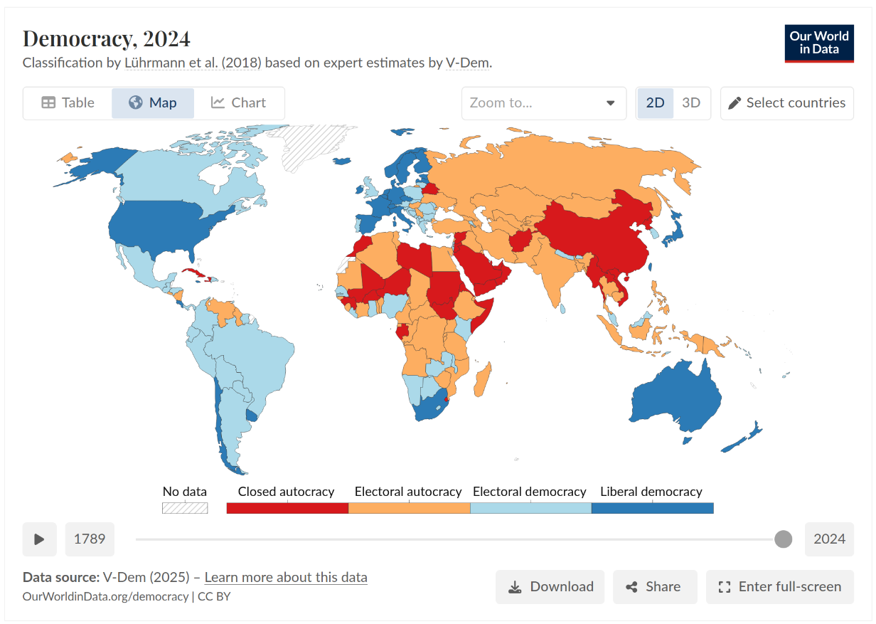 Update 2025-10-23 (PST) (AI summary of creator comment): The market will resolve according to the Regimes of the World classification system, which uses the following categories: