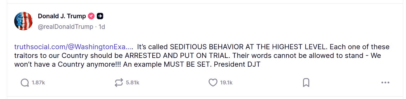 On the 18th November 2025, Sen. Elissa Slotkin, along with Sen. Mark Kelly, Rep. Chris Deluzio, Rep. Maggie Goodlander, Rep. Chrissie Houlahan and Rep. Jason Crow, recorded and published a video, in which they claim that there is a threat to the Constitution from inside the US, and that members of the US military are able to and required to refuse illegal orders.