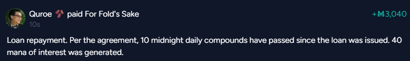 Loan insurance policy fee: 85 manaUnrealised profit: 250 mana