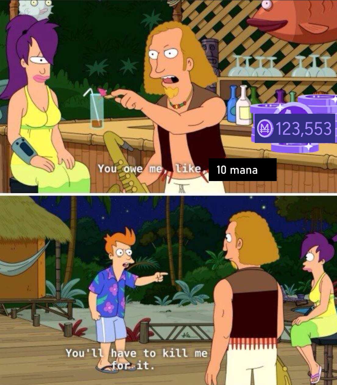 @4fa I don't need much, is the thing. Maybe something on the order of 1k to 5k mana. My goal is to have some liquidity in my pocket in case I see a random mispriced opportunity in the wild.