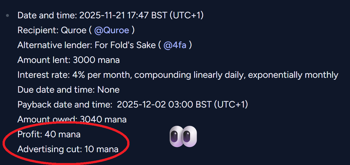 Payback date and time: 2025-05-01 21:52 BST (UTC+1)Profit: 25 mana