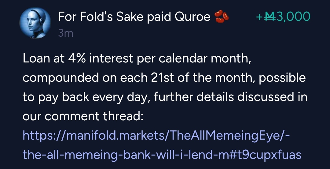 If you would like a loan, please leave a comment, and I will hopefully respond within a day or two. Initially, I may only offer much smaller loans than others (e.g. 100 mana) to build up lender trust, but I'm usually willing to take a lower interest rate, and the loan size offered may significantly increase as trust improves.