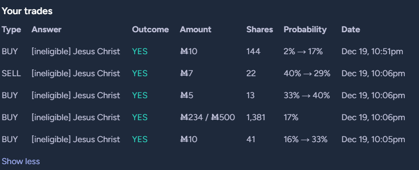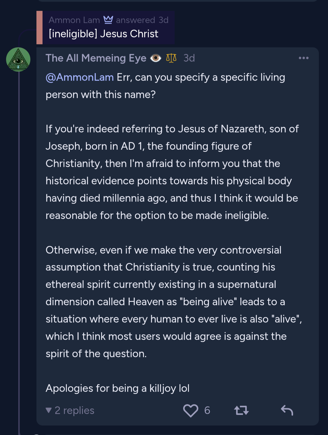 @TiredCliche the historical and biological evidence is that, like Jesus of Nazareth, his body almost certainly died many years ago. By default I must personally be convinced that they are indeed alive to be eligible, with that only being overridable by a Manifold poll asking if they're alive with over 30 total votes cast and over 2/3 of votes saying yes (excluding bribes and alts)