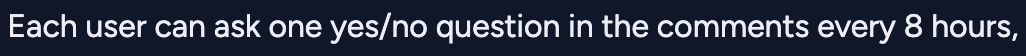Each user can ask one yes/no question in the comments every 8 hours, and I will try to answer in a timely manner. The answers I give will be limited to "yes," "no," and "unknown."