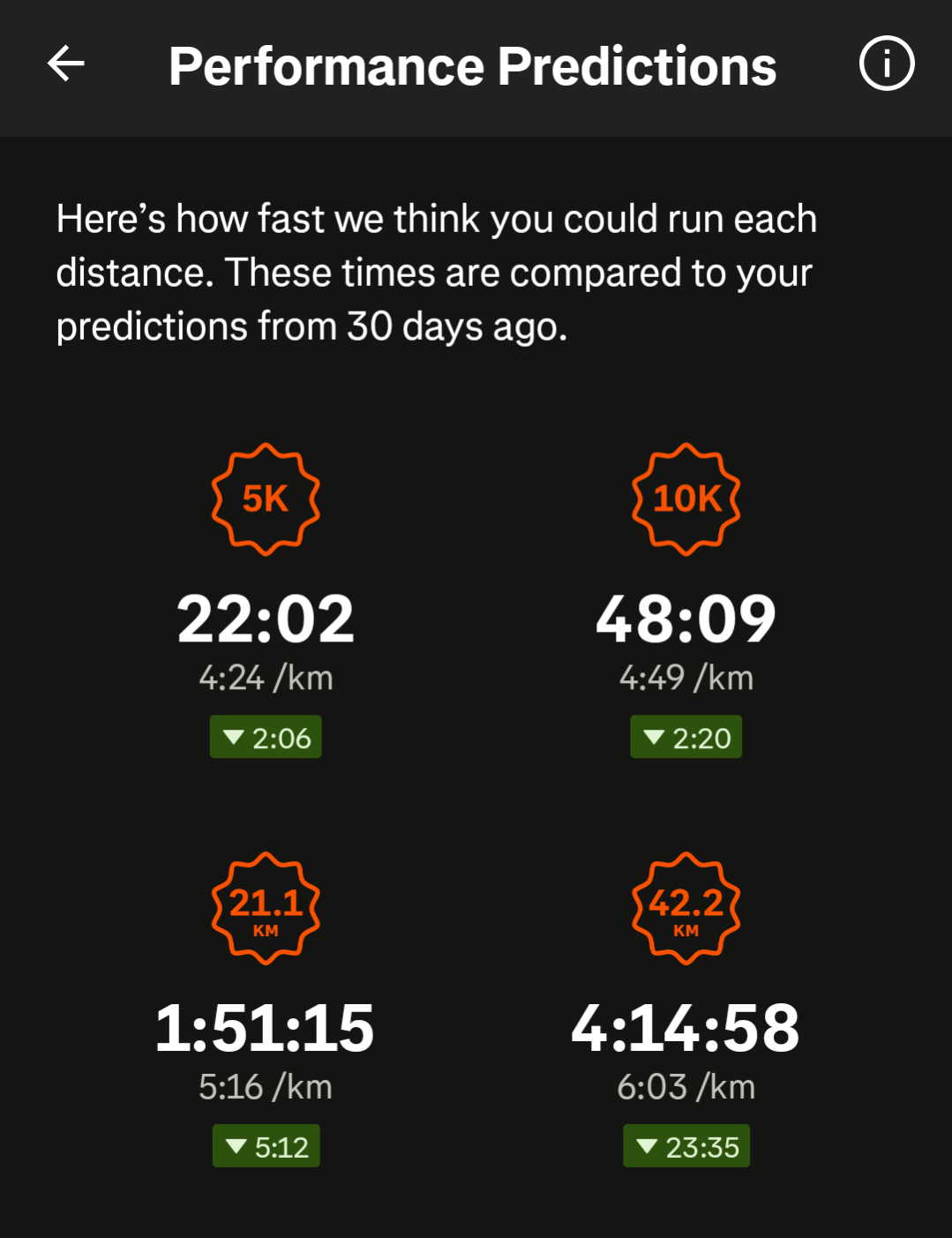 Strava seems to think that's a good sign for my target of running a 22 minute 5K. But 20 minutes is basically impossible, and 21 would be really hard.