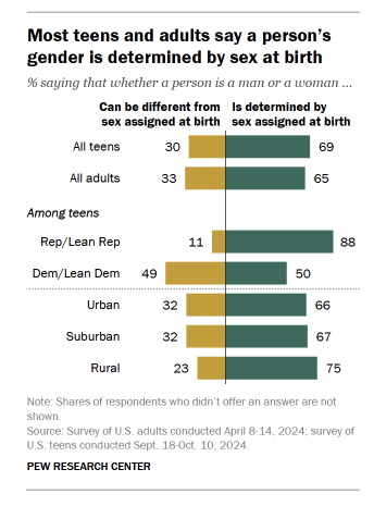 For the record, the reported percentage of registered voters saying gender is determined by sex assigned at birth is 65% (using survey data from April 2024).