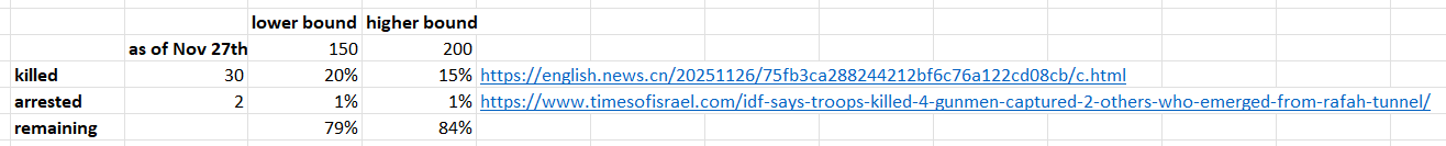 Approximately 200 Hamas gunmen are located in tunnels underneath IDF-controlled parts of southern Gaza, especially in Rafah, and are unable to retreat to Hamas-controlled areas without emerging from their tunnels and being spotted by Israeli troops. The group's military wing said on November 9, 2025, that mediators have been urged to resolve the crisis, which threatens the month-old ceasefire.