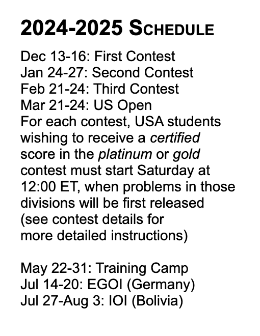 USACO aka the USA computing olympiad has not released the 2025-2026 contest schedule yet. Market resolves based on when the schedule will be released on usaco.org. Based on PDT time.
