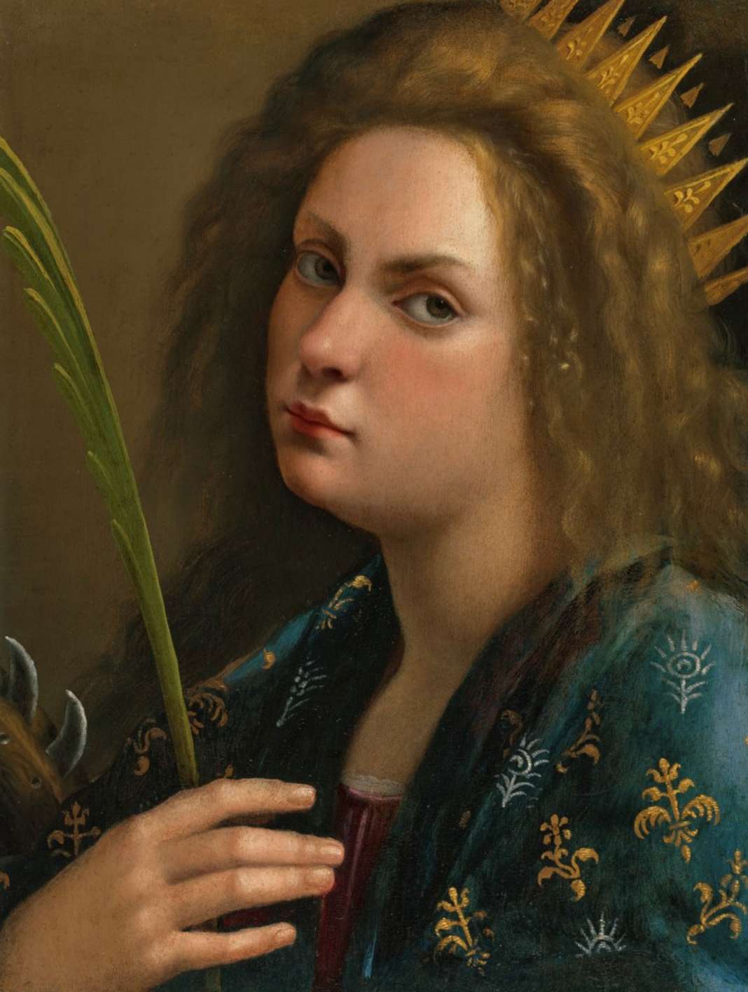 In this intimate picture on panel, Artemisia paints herself in the guise of the fourth-century saint Catherine of Alexandria. She holds a martyr’s palm, wears a crown and embroidered cloak denoting Catherine’s royal status, and is accompanied by a broken wheel studded with iron spikes – symbol of the saint’s martyrdom and her standard attribute in art. Her right hand, delicately holding the palm frond, is raised to her chest. Artemisia’s head occupies most of the picture space, drawing the viewer into a close and intimate encounter, and the tight crop further focuses our attention on her resolute expression. (Lot essay)