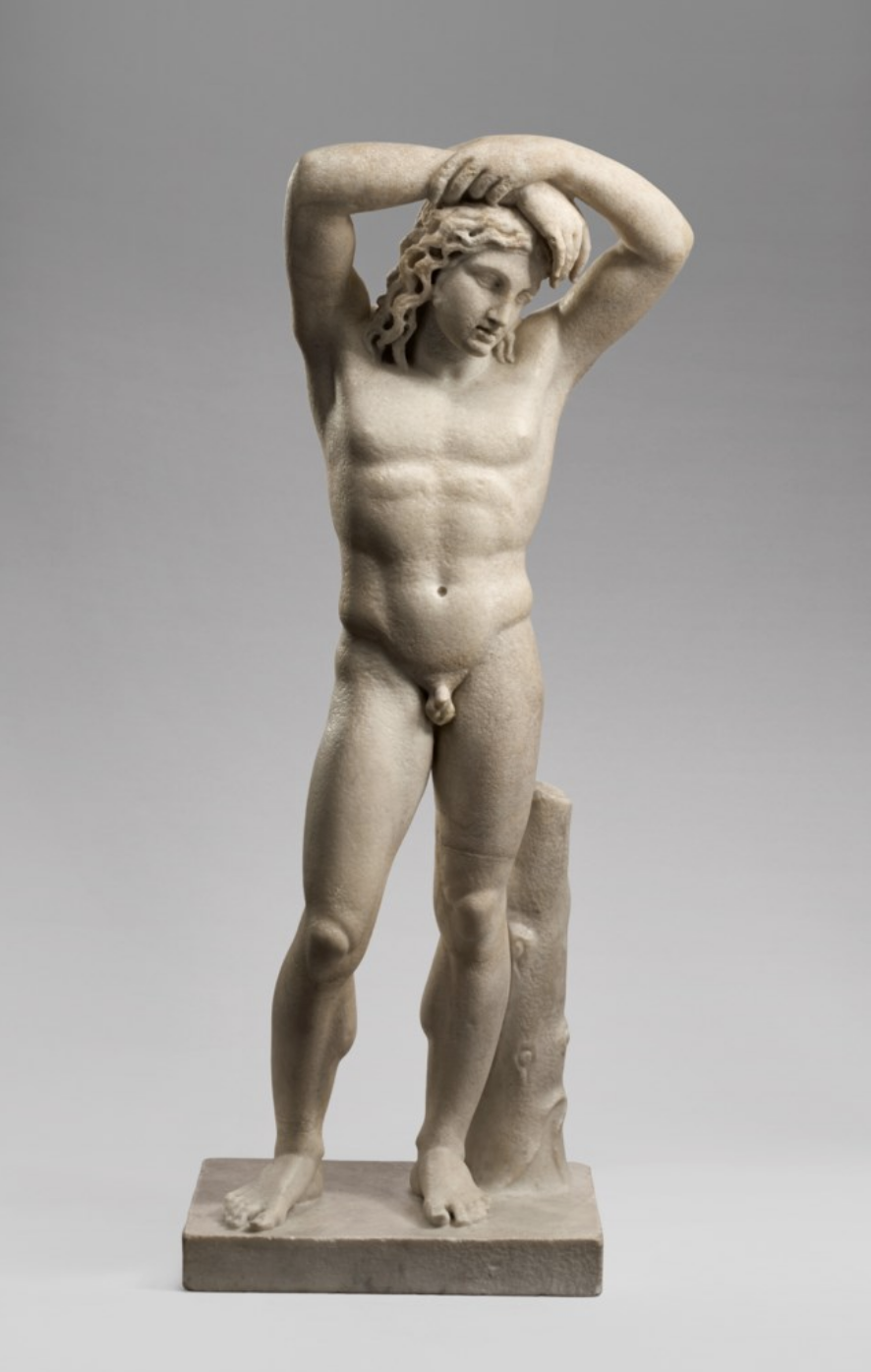 This splendid depiction of Narcissus shows the youth standing in contrapposto, his weight on his left leg and his right at ease. He is depicted nude, standing with his arms over his head, with his right hand clasping his left wrist. He looks down and to his left with his long, luxurious locks falling onto his shoulders. A support in the form of a tree trunk abuts the back of his left leg and a mortice is present on his right shoulder, likely to accommodate the inclusion of a now-missing separately-made figure of Eros. The statue was expertly resorted in the 18th-19th century, including the base and tree trunk support along with the lower part of the left leg from the knee down; the right leg from below the hip; the genitalia and parts of the buttocks; some small areas to the upper right arm and shoulder and to the left elbow and shoulder; the fingers of the right hand; the crown of the head; and to areas of the nose, lips, chin and left eye. (Lot essay)