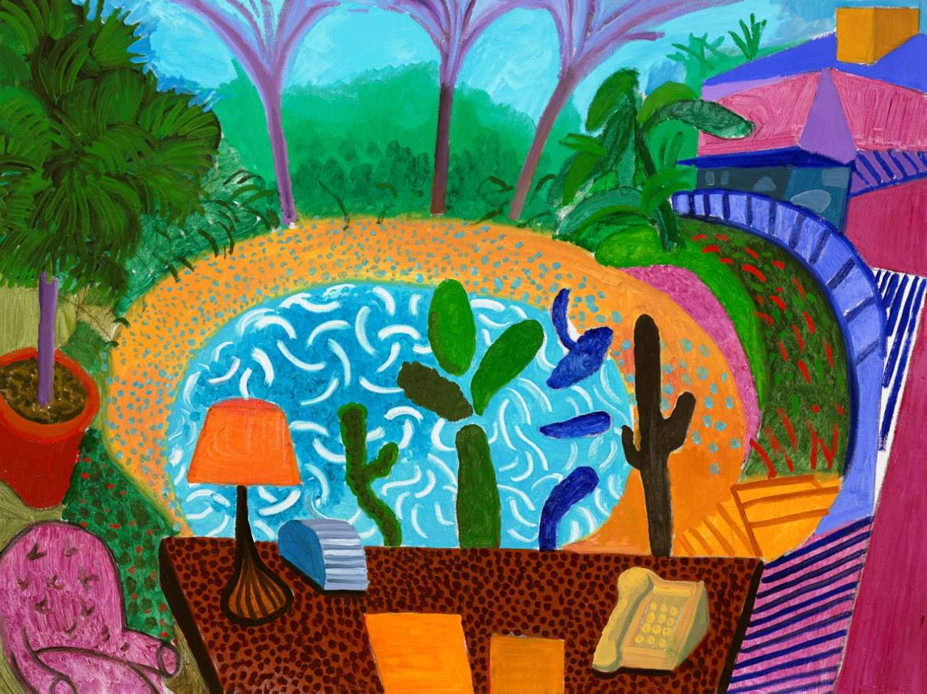 Luscious strokes of vibrant, Fauvist colors coalesce in David Hockney’s My Garden in Los Angeles, London, July 2000 in a virtuoso demonstration of mature mastery. The painting mediates on two of Hockney’s most pressing concerns—that of memory and that of space—resolving a decades-long dilemma around the uses of perspective in his paintings. The present work is a culmination of this exploratory process, synthesizing the lessons which Hockney learnt across his painted landscapes of Yorkshire, his abstract paintings, and his theatre productions. Here, the artist establishes a dynamic, expansive, and vivid point of view reflecting his own treasured memory of the distinctive pool, terrace, and garden at his Hollywood Hills home. Painted in London, The work is a deeply personal reflection on his memory of this intimate space as well as on his famous pool motif. Finally escaping the restrictions of conventional Albertian one-point linear perspective, Hockney opens up a new and expansive universe, depicting in paint the third and fourth dimensions in order to express an exciting sense of space, movement, and emotion on the flat surface of his canvas. (Lot essay)