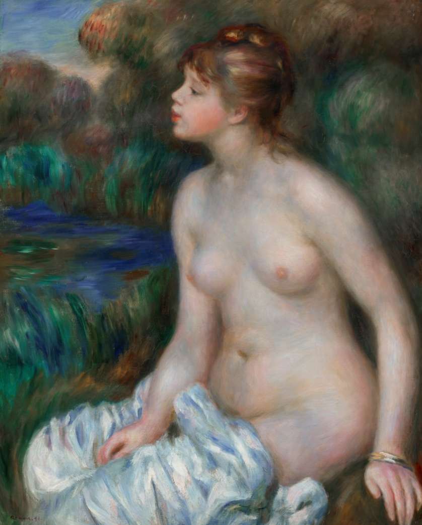 There is an inherent tranquility to the scene, accentuated by the model’s relaxed, unselfconscious demeanor as she gazes off into the distance, unafraid of being discovered in her state of undress. The naturalness of the scene reflects the artist’s extensive experience with painting en plein air, which allowed him to convey the fleeting passage of diffused light as it shifts over her form. The surface of her skin is rendered in a lively play of subtly variegated color, from creamy peach tones and blush pinks, to soft lavenders and cool blues, which intertwine and overlap in a carefully orchestrated network of delicately layered brushstrokes that articulate the volumes of her body. (Lot essay)