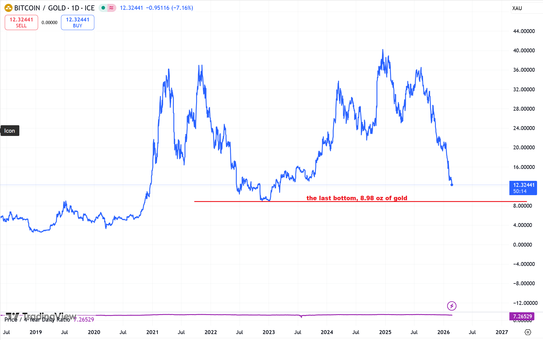 8.98 ounces of gold per bitcoin was the bottom price of bitcoin in gold in last cycle.