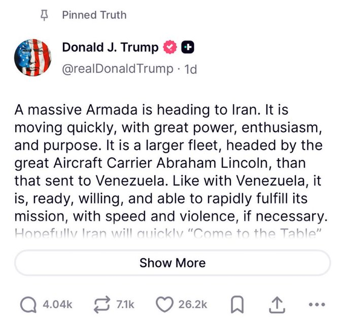 Trump on Truth Social 1/28/26: "A massive Armada is heading to Iran. It is moving quickly, with great power, enthusiasm, and purpose. It is a larger fleet, headed by the great Aircraft Carrier Abraham Lincoln, than that sent to Venezuela. Like with Venezuela, it is, ready, willing, and able to rapidly fulfill its mission, with speed and violence, if necessary. Hopefully Iran will quickly “Come to the Table” and negotiate a fair and equitable deal - NO NUCLEAR WEAPONS - one that is good for all parties. Time is running out, it is truly of the essence! As I told Iran once before, MAKE A DEAL! They didn’t, and there was “Operation Midnight Hammer,” a major destruction of Iran. The next attack will be far worse! Don’t make that happen again. Thank you for your attention to this matter! President DONALD J. TRUMP"