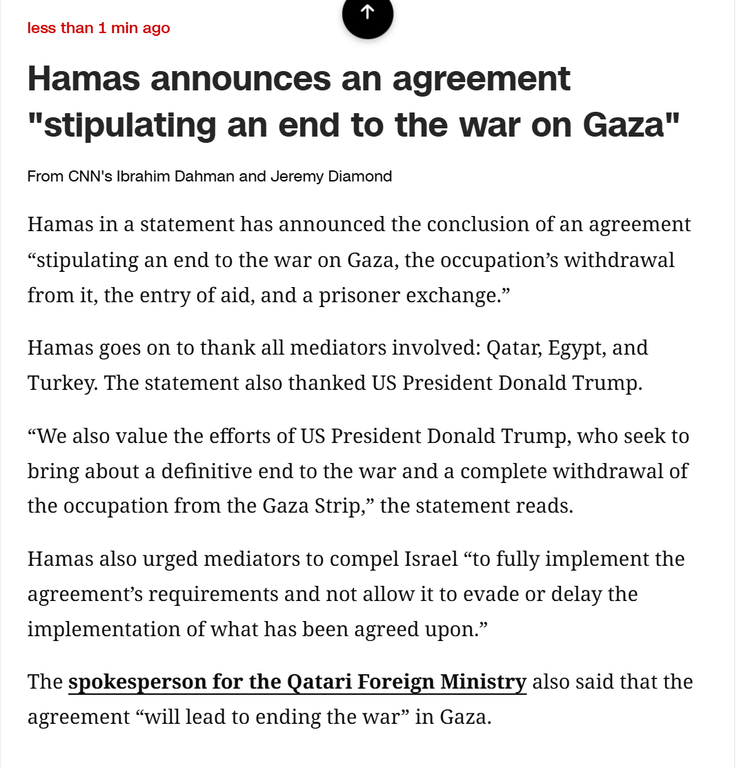 My read is that this hits point 3 of the agreement military operations suspended) but we don’t know whether points 1, 2, 4, 13, or 16 (Gaza terror free zone, Gaza redevelopment, all hostages returned in 72 hours, Hamas has no governance role, conditional Israeli withdrawal) are agreed at this stage. Should not be 80%