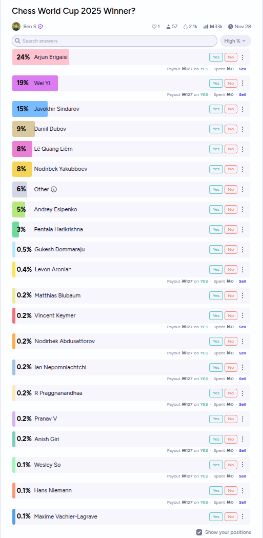 Resolves to the winner of the FIDE 2025 Chess World Cup. In the (extremely unlikely / unprecedented / probably illegal) event of a tie, resolves equally to the winners.