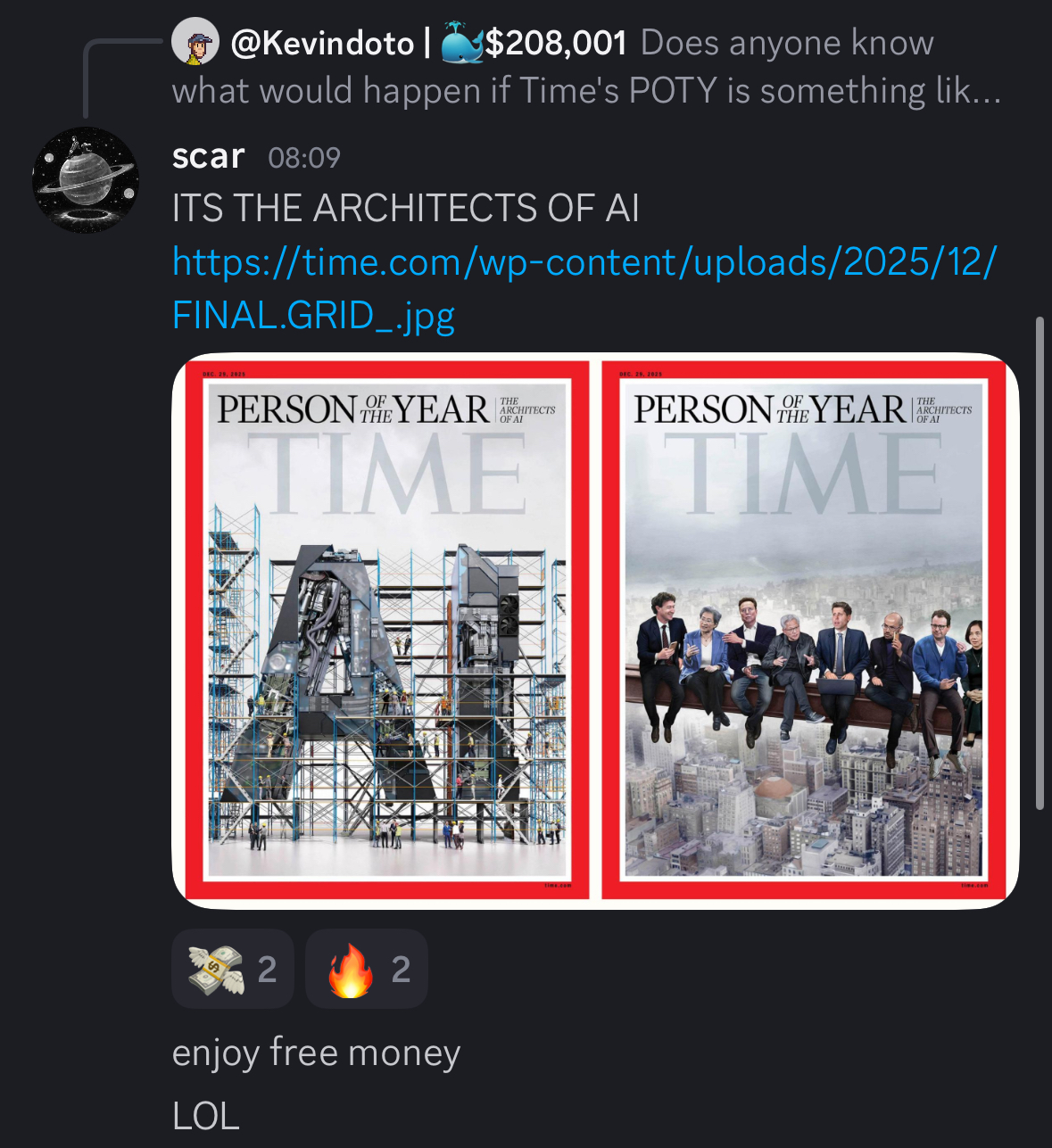 @ItsMe I think there are many good reasons for that, and markets move for all kinds of reasons apart from explicit leaks. It’s pretty clear the latter leak was an actual leak of the cover. The former one was probably just people reacting to information about the other TIME “people of the year” and the lack of a shortlist.