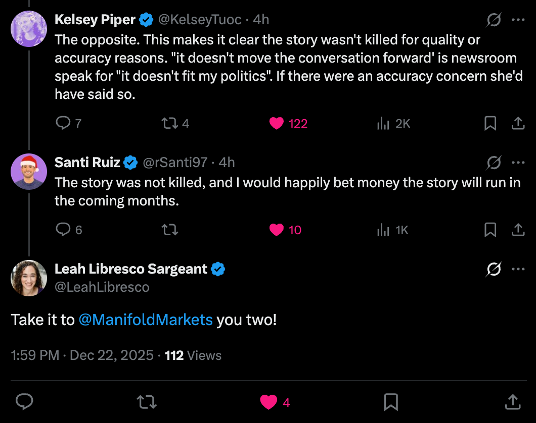 The correspondent who reported the story, Sharyn Alfonsi, said in an internal memo that "the public will correctly identify this as corporate censorship". Weiss stated the story "did not advance the ball" beyond what other news outlets already had reported, raising questions about whether editorial or political considerations drove the postponement.