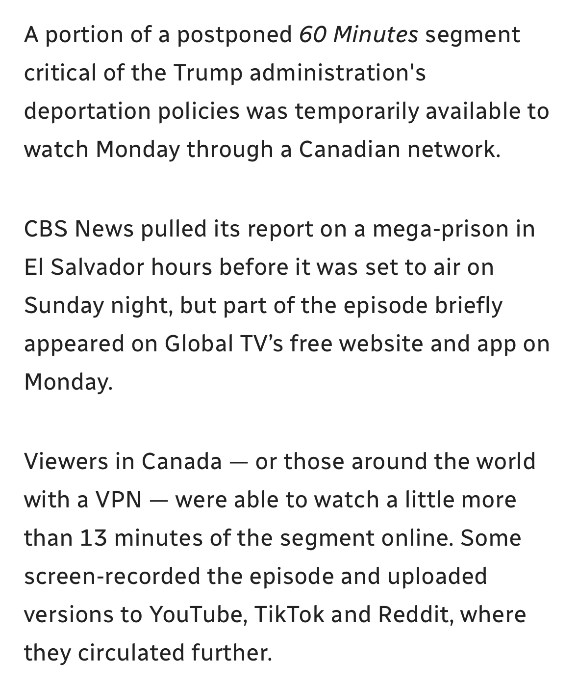 CBS News pulled a "60 Minutes" report on El Salvador's CECOT prison just hours before its scheduled Sunday broadcast on December 21, 2025, saying it would air at a future time. The segment featured accounts of Venezuelan men deported by the Trump administration to a notorious maximum-security prison in El Salvador. The story was screened five times and cleared by both CBS attorneys and Standards and Practices, according to correspondent Alfonsi. CBS News Editor-in-Chief Bari Weiss raised several concerns with producers about the segment and requested a substantial amount of new material to be added, including an interview with White House official Stephen Miller or another senior Trump administration figure.