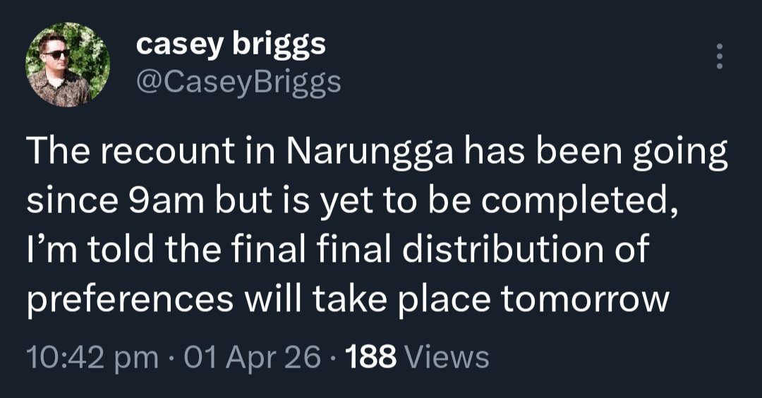 Update 2026-03-31 (PST) (AI summary of creator comment): If there is a recount (e.g. for Narungga), resolution will be delayed until the ABC calls the result.