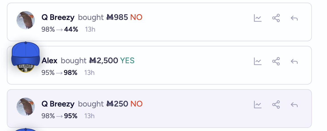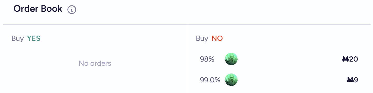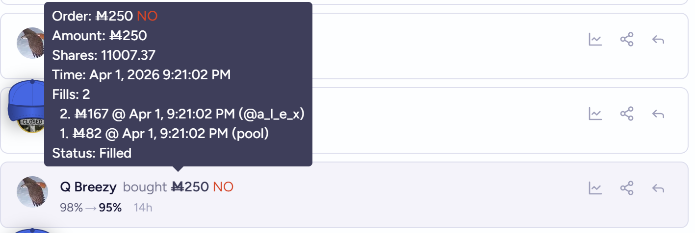 In this case, it was the NO trade which filled a limit order. At such a high %, M250 NO was matched against a limit set by alex and the 'pool' (AMM) for 11,000 shares