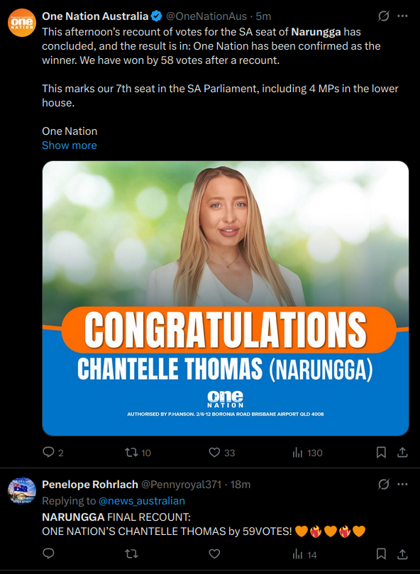 Results YES iff One Nation is elected to 4 seats or more in South Australia's 2026 election according to the ABC: