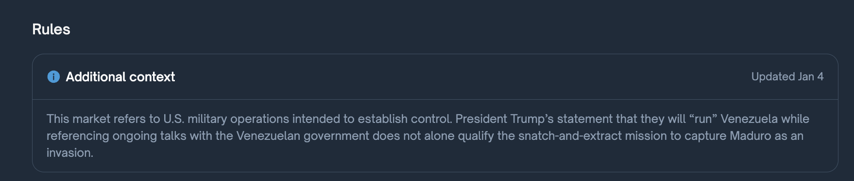 @BrunoParga Sure, I’m not going to reply any further either, but your arguments were all in reference to the market title. The “additional context” provided on polymarket after the fact is different to the actual meaning of the market. I’m glad I don’t bet on there, but essentially they have created a market with a different meaning to what they wanted it to have, and rather than accepting that meaning they’ve decided to change it to fit their meaning once the event has already taken place.