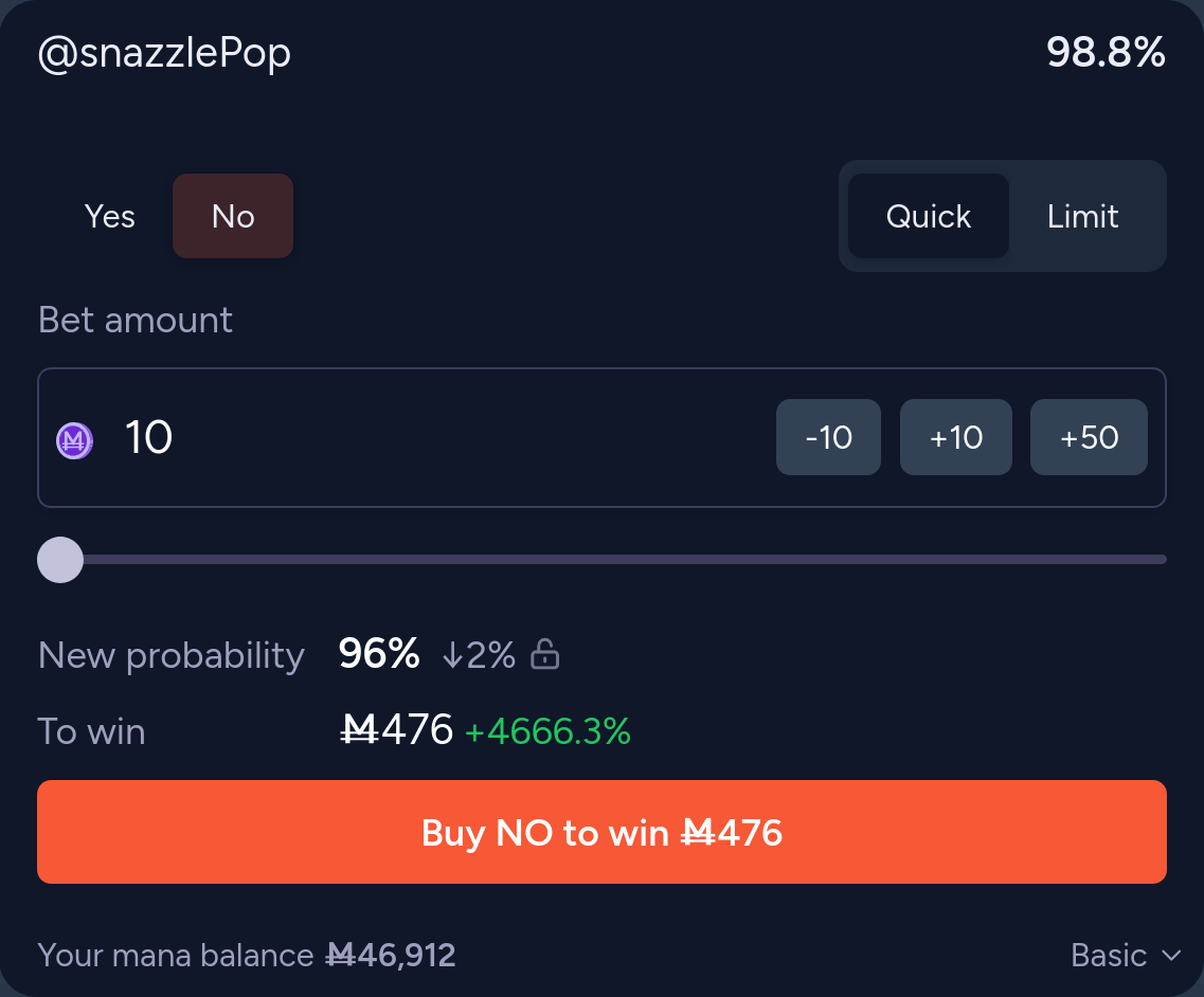 You may find it difficult to find a counterparty, since you can't bet the AMM above 99%. To solve this, place a 99% YES limit order (the "Max YES payout" tells you how much shares you would be buying), private message me a good trading tip, and the DIAPIO financial complex will fill the limit order if the trading tip isn't stupid (e.g. "buy low, sell high" or "bet 10k YES on daily coinflip").