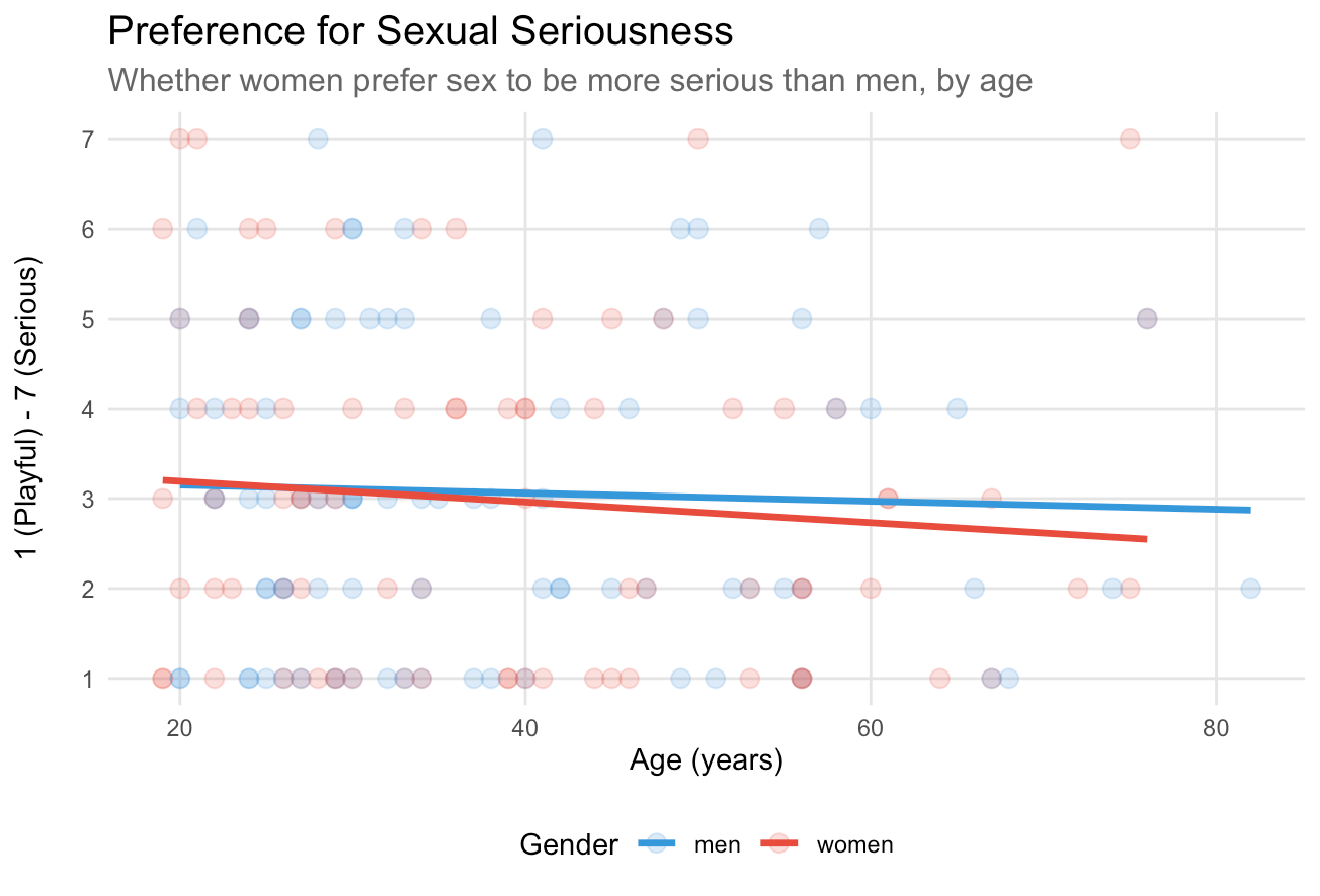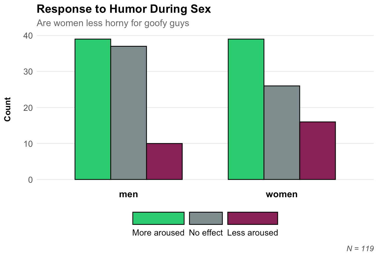 I surveyed 170 US participants on Prolific and asked them two questions: "In my ideal sexual encounter, my partner would act more: (1) Playful - (7) Serious" and "Imagine that your partner makes a funny joke during a sexual encounter. This would make you feel: More aroused, Less aroused, No effect on my arousal."