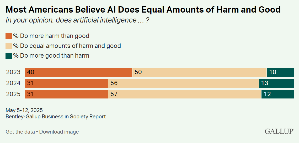 This question resolves YES if Gallup polling for 2025 shows more Americans believe AI will do "more good than harm" than in 2024, i.e. 14% or higher. This question resolves NO if the results are the same (13%) or lower.
