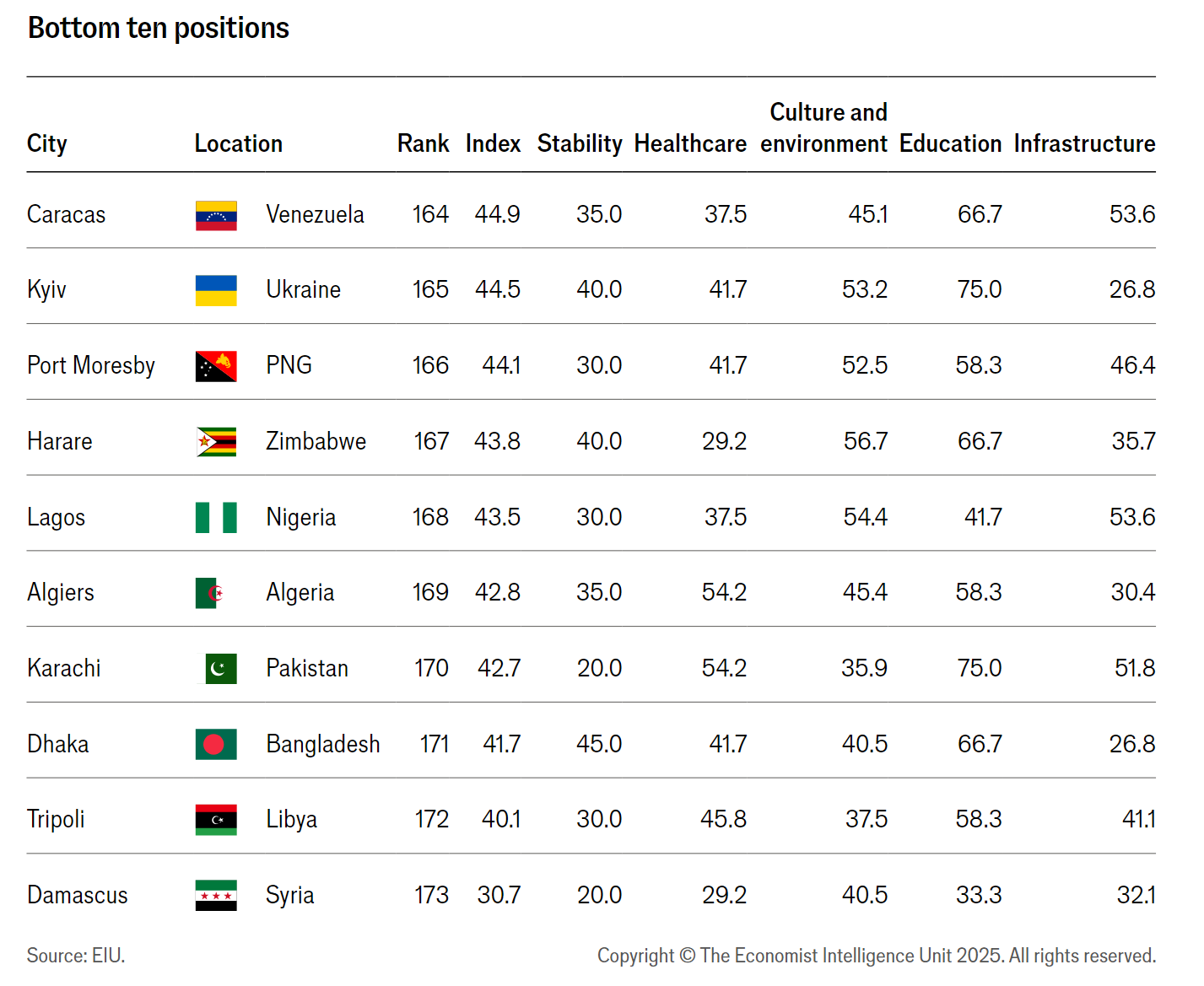 The Economist Intelligence Unit (EIU) annually ranks cities by livability, releasing a free summary report every summer. The Global Livability Index 2023 ranked Ukraine's capital,Kyiv (Kiev), at 165th out of 173 cities "owing to the damage the war has done to its stability, infrastructure and general liveability." The Global Livability Index 2024 kept Kyiv in the bottom 10, and in 2025 it did so again. Here are all of the 10 least livable cities of 2025: