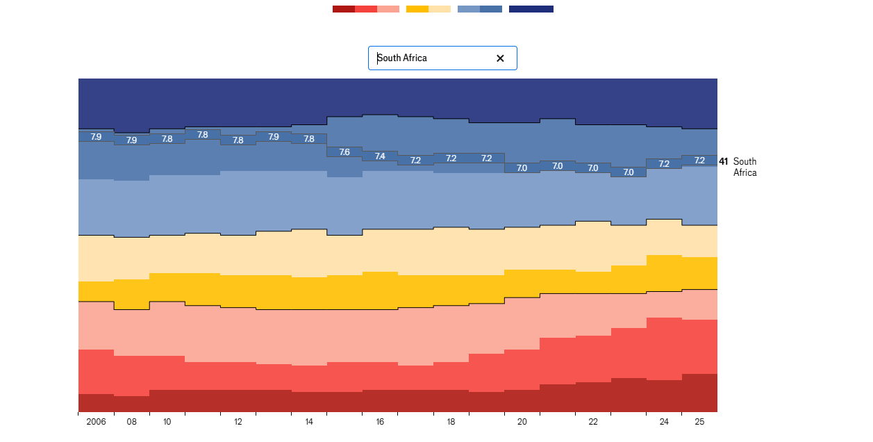 This question will use The Economist's Democracy Index, resolving YES if South Africa's democracy score is lower in the next report (to be published in early 2026) compared to the last report (which can be found here).
