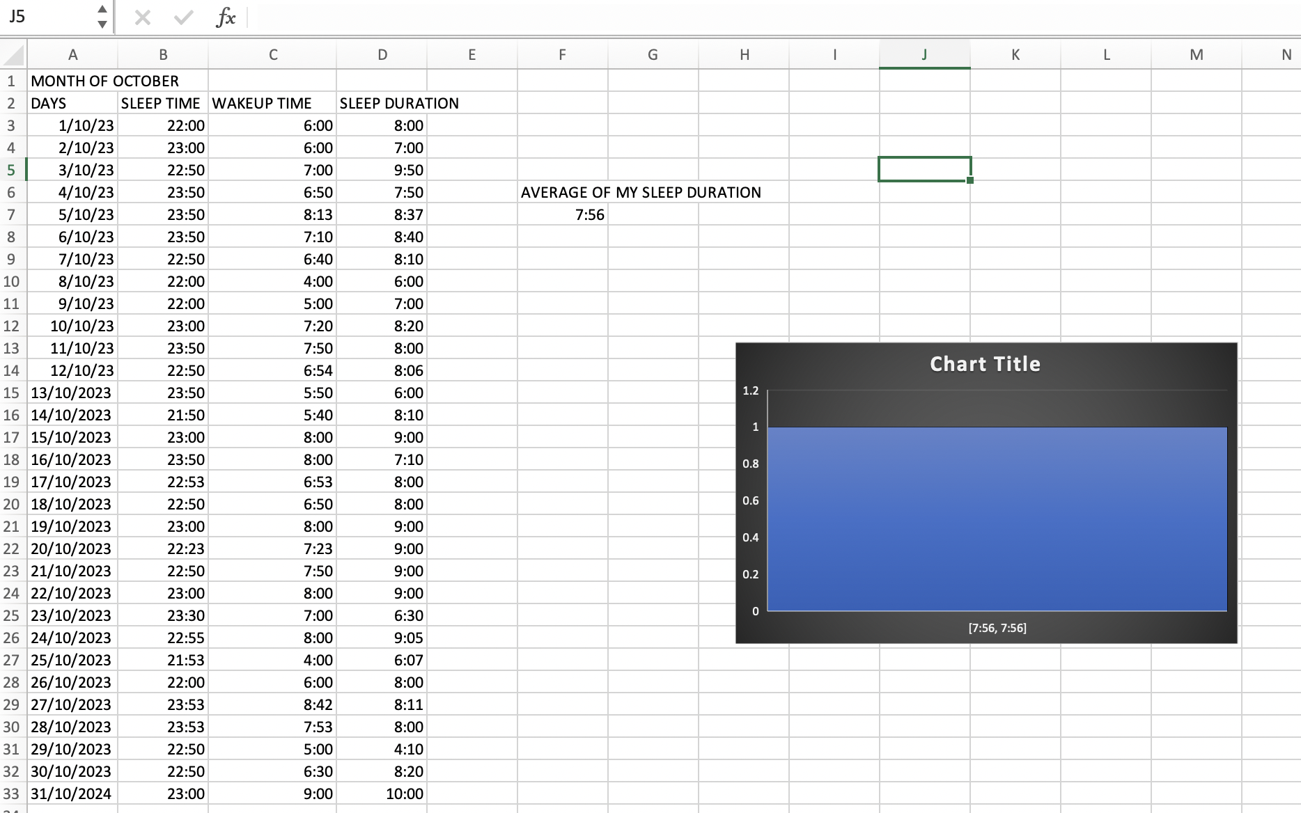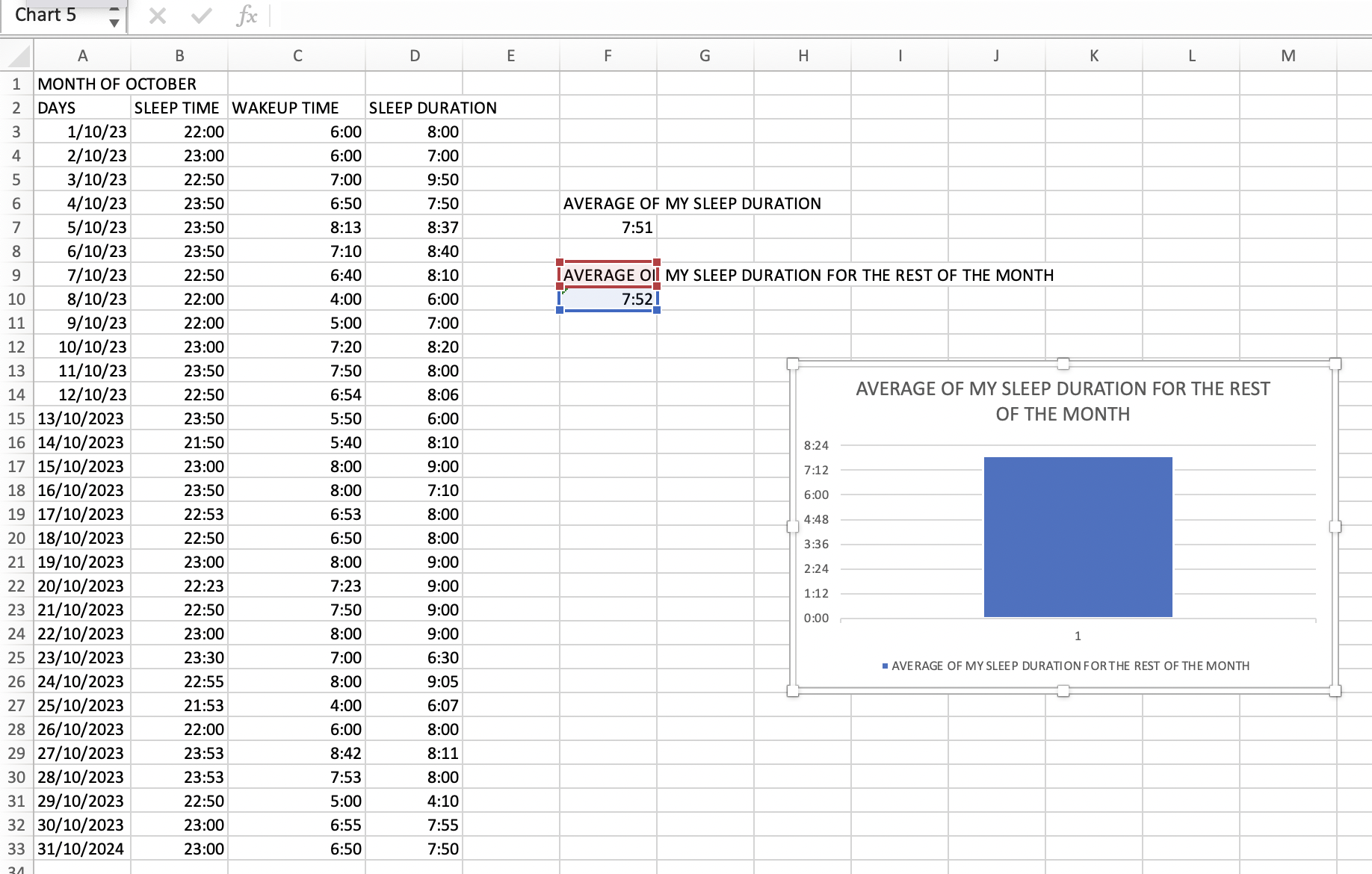 I will average 7.5 hours of sleep through the rest of October. starting from the month of October my alarm is set to sleep at 10pm when i have classes at 9am and at 11pm when i have classes at 10am. there are few times my alarm is set earlier due to certain reasons. I do sleep at 9pm on certain days so i can wake up early. so, through the month it has been the same routine and below is my excel sheet of my sleep time and wakeup time for the month of October and the average across the month and the average for the remaining of the month.